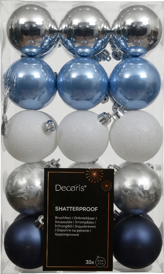 | Name | Christbaumkugeln - 30 Stück - Kunststoff - ø ca. 6 cm - blau/silber/weiß |