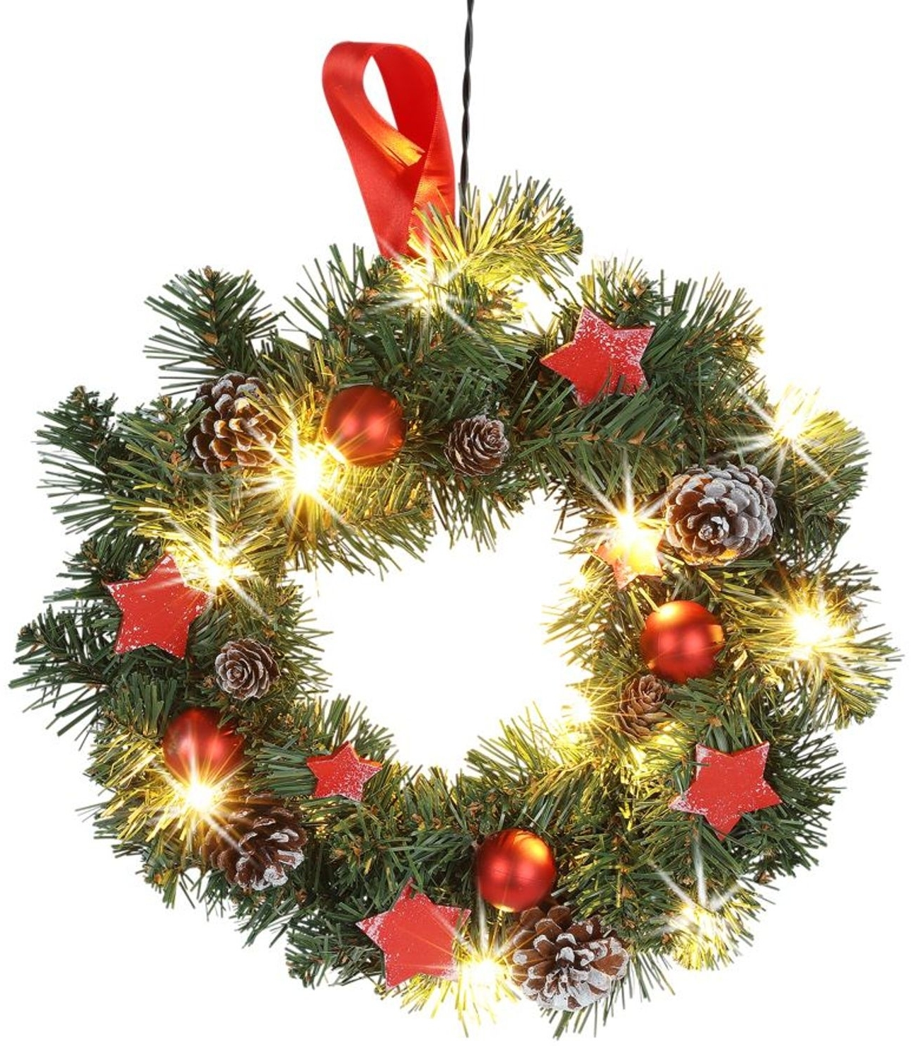 Dekorativer Weihnachts-Türkranz mit einem Durchmesser von ca. 30 cm, gefertigt aus künstlichem Tannengeflecht. Der Kranz ist geschmückt mit Zapfen, Kugeln und Holzsternen sowie einer Lichterkette, die 15 warmweiße LEDs enthält. Diese sorgen für eine festliche Atmosphäre in Ihrem Zuhause. Die LED-Birnen sind langlebig und energiesparend. Der Kranz ist batteriebetrieben und eignet sich ausschließlich für den Innenbereich. **Highlights** - 15 warmweiße LED-Lämpchen für festliche Beleuchtung - Geschmückt mit Zapfen, Kugeln und Holzsternen - Batteriebetrieben für flexible Platzierung - Mit Bändchen zum einfachen Aufhängen - Nur für den Innenbereich geeignet **Produkteigenschaften** - Maße (D x T): ca. 30x8 cm - Material: künstliches Tannengeflecht - Hohe Leuchtkraft der LEDs - Langlebig und energiesparend **Lieferumfang** - Weihnachts-Türkranz - Batterien (3x1,5V AA) nicht im Lieferumfang enthalten