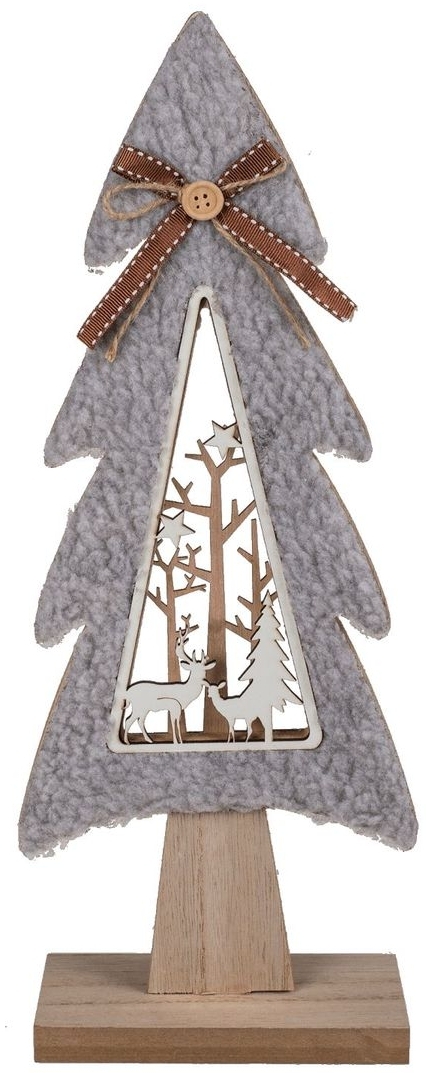 Der Weihnachtsbaum mit Stillleben ist eine stilvolle Dekoration für die festliche Jahreszeit. Mit einer Höhe von ca. 40 cm und einem plastischen Stillleben im Kern, umrandet von weichem Teddyfleece, zieht er alle Blicke auf sich. Das Herzstück bildet ein weiß koloriertes Stillleben von einem Hirsch mit Reh im Wald. Gekrönt wird der Baum von einer charmanten Schleife mit Knopf. **Highlights** - Plastisches Stillleben im Kern - Umrandung aus weichem Teddyfleece - Charmante Schleife mit Knopf als Akzent - Weiß koloriertes Stillleben von Hirsch und Reh - Stilvolle Dekoration für die festliche Jahreszeit **Produkteigenschaften** - Modell: Weihnachtsbaum mit Stillleben - Maße (HxBxT): ca. 40 x 14,5 x 6,5 cm - Material: Holz - Farbe: Grau oder Hellbraun