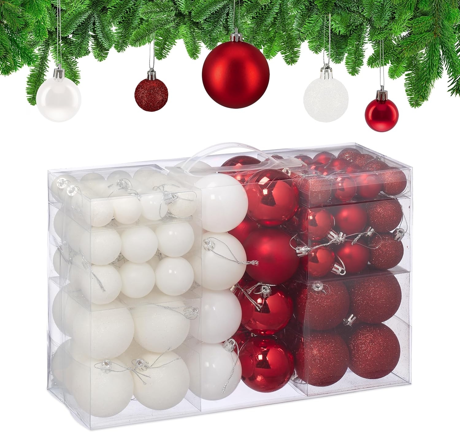 Mit dem Weihnachtskugeln Set 10051292_776 verleihen Sie Ihrem Tannenbaum einen festlichen Glanz. Die Kugeln in verschiedenen Größen und Oberflächen – matt, glänzend und glitzernd – ermöglichen eine individuelle und geschmackvolle Dekoration. Die silbernen Bändchen erleichtern das Aufhängen der Kugeln. Dieses Set sorgt für eine besinnliche Atmosphäre und bringt Freude in die Weihnachtszeit. **Highlights** - Kugeln in unterschiedlichen Größen für eine individuelle Anordnung - Oberflächen in matt, glänzend und glitzernd für abwechslungsreiche Akzente - Leichtes Aufhängen dank silberner Bändchen - Robustes und leichtes Material aus Polystyrol - Inklusive praktischer Aufbewahrungsbox mit Henkel **Produkteigenschaften** - Maße kleine Kugeln H x D: ca. 4x3 cm, ca. 1 g - Maße mittlere Kugeln H x D: ca. 5x4 cm, ca. 3 g - Maße große Kugeln H x D: ca. 7x6 cm, ca. 7 g - Farbe: Weiß, Rot - Dekorativer Baumschmuck für ein stimmungsvolles Fest **Lieferumfang** - Weihnachtskugeln in Aufbewahrungsbox (in gewählter Stückzahl) - Dekoartikel sind nicht im Lieferumfang enthalten