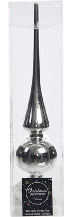 * Setzen Sie Ihren Weihnachtsbaum mit dieser schönen Christbaumspitze in Szene. Die Weihnachtsbaumspitze verwandelt Ihren Christbaum in ein echtes Highlight und lässt sich gut mit anderem Christbaumschmuck kombinieren. * Material: Glas * Maße ca.: ø 6 x 26 cm * Farbe: silber glänzend * Verpackungseinheit: 1 Stück