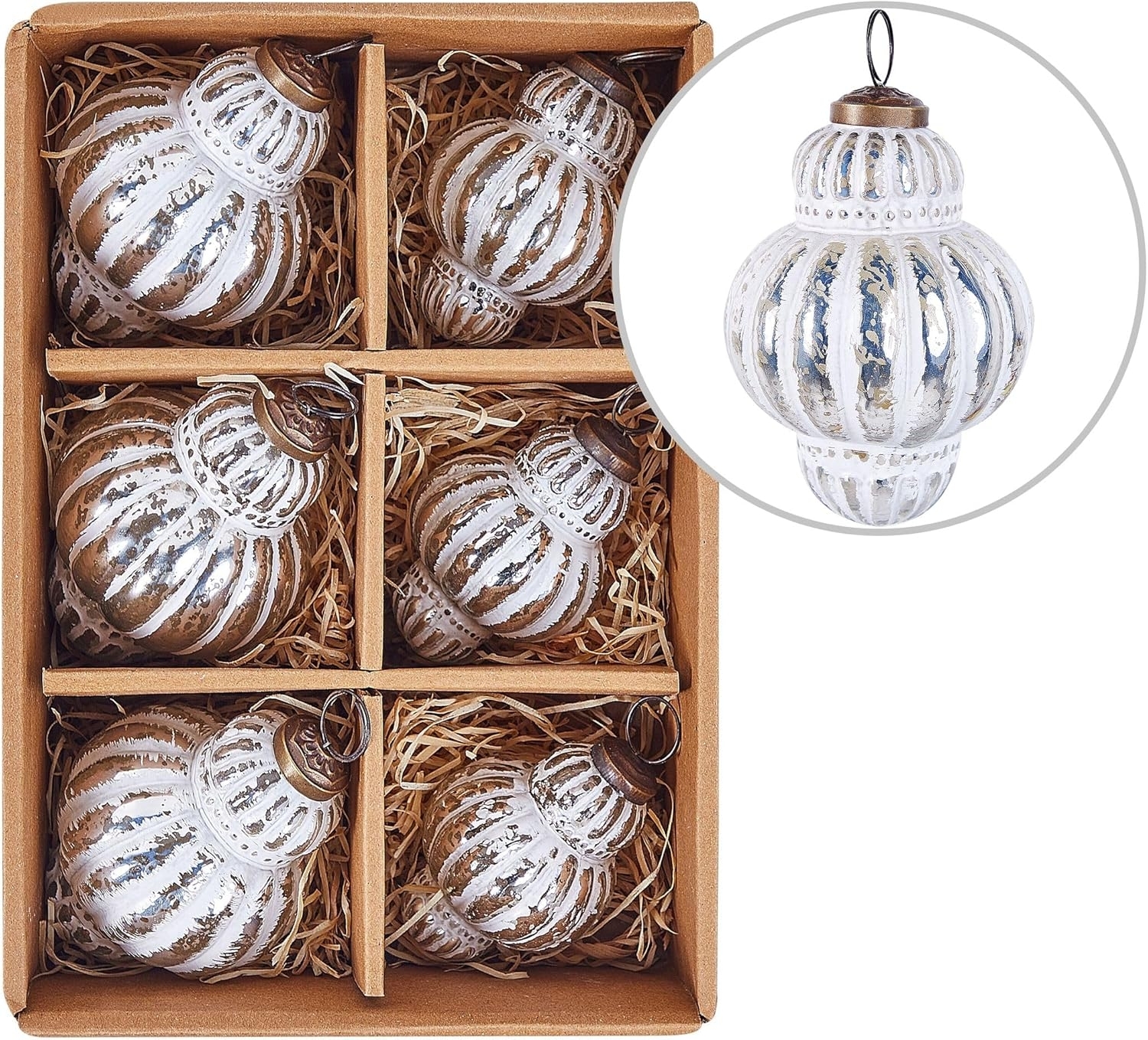 Sechs handgefertigte, orientalische Glaskugeln in Silber für Ihren Weihnachtsbaum. Diese klassischen Weihnachtsbaumkugeln verleihen Ihrem Zuhause eine gemütliche Atmosphäre und bestechen durch ihre besondere Form sowie die Antik-Optik. Dank der festsitzenden Käppchen lassen sich die Kugeln mühelos anbringen. Ideal für den Tannenbaum, Kränze, Gestecke und Tischschmuck. **Highlights** - Handgefertigte Präzision für ein einzigartiges Design - Zeitloses, klassisches Design in Silber - Gemütliche Ausstrahlung für festliche Dekoration - Festsitzende Käppchen für einfache Anbringung - Vielseitig einsetzbar für verschiedene Dekorationsarten **Produkteigenschaften** - Typ: Weihnachtsbaumkugeln - Stil: Klassisch - Farbe: Silber - Material: Glas - Zusätzliches Material: Metall - Finish: Gefärbt - Handgefertigt: Ja - Maße (HxBxT): 11 x 7 x 7 cm / 14 x 7 x 7 cm - Gewicht: 0,6 kg **Lieferumfang** - 1 x Weihnachtsbaumkugel-Set (6 Stück) - Ausschluss: Weitere Dekorationselemente sind nicht enthalten