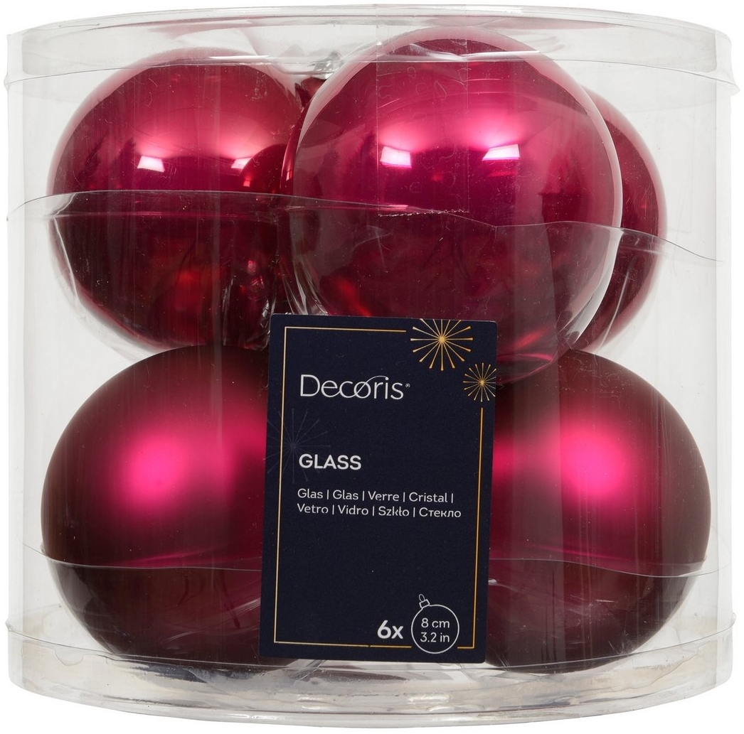 Präsentieren Sie Ihren Weihnachtsbaum mit den festlichen Kaemingk Weihnachtsbaumkugeln in Rosa. Diese hochwertigen Christbaumkugeln aus Glas haben einen Durchmesser von ca. 8 cm und kommen im Set mit 6 Kugeln. Die Kombination aus matten und glänzenden Oberflächen sorgt für einen eleganten Look. Ideal als Christbaumschmuck oder Tischdekoration, bringen sie eine festliche Atmosphäre in jeden Raum. **Highlights** - Hochwertige Weihnachtsbaumkugeln aus echtem Glas - Durchmesser: ca. 8 cm - Set mit 6 Kugeln - Kombination aus matten und glänzenden Oberflächen - Vielseitig einsetzbar als Christbaumschmuck oder Tischdekoration **Produkteigenschaften** - Farbton: magenta, fuchsia, beere - Kugelform: rund - Stil: uni, einfarbig - Farbgruppe: rosa, pink - Verpackung: 6 Stück in Dose **Lieferumfang** - 6 Weihnachtsbaumkugeln aus Glas - Keine weiteren Produkte enthalten