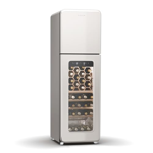 - **Zwei Temperaturzonen**: Genießen Sie die perfekte Lagerung für Rot- und Weißweine dank der getrennten Temperaturzonen, während das obere Fach auch als Gefrierbereich dient. **Stilvolles Retro-Design**: Mit seiner eleganten Vintage-Optik und der stilvollen LED-Beleuchtung fügt sich dieser Kühlschrank harmonisch in jede Wohn- oder Kücheneinrichtung ein. **Großes Fassungsvermögen**: Platz für bis zu 63 Flaschen sorgt dafür, dass Ihre Weine unter optimalen Bedingungen gelagert werden und ihre Qualität langfristig erhalten bleibt. **Hybrid-Regale**: Die Kombination aus stabilen Metallrosten und ansprechenden Holzfronten minimiert Vibrationen und bietet eine attraktive Präsentation Ihrer Weinsammlung.