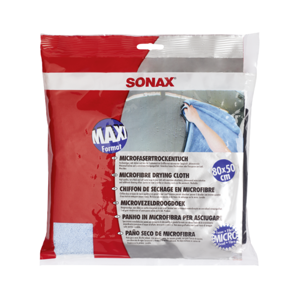 - SONAX MicrofaserTrockenTuch Plus hat eine Größe von 80 x 50 cm, was es zu einem großflächigen Trockentuch macht.