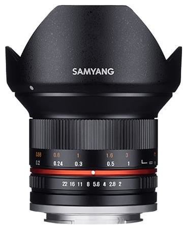 - Das Samyang 12mm F2.0 Objektiv bietet eine Brennweite von 12 mm, ideal für Weitwinkelaufnahmen.