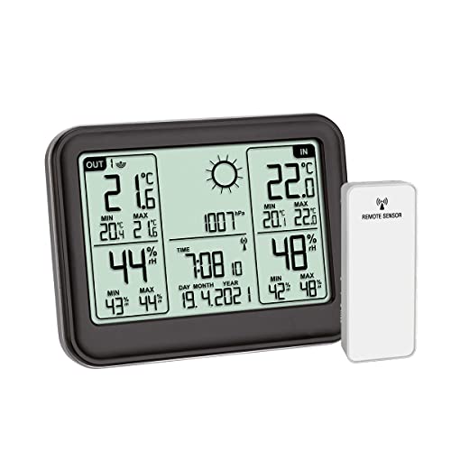 - Sie verfügt über ein übersichtliches Display, das einfach abzulesen ist und permanent die Höchst- und Tiefstwerte sowie die Temperatur und Luftfeuchtigkeit für innen und außen anzeigt