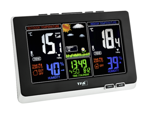 - Die TFA Funk-Wetterstation Spring verfügt über ein farbig beleuchtetes Display mit animierten Wettersymbolen, das ansprechend gestaltet ist.