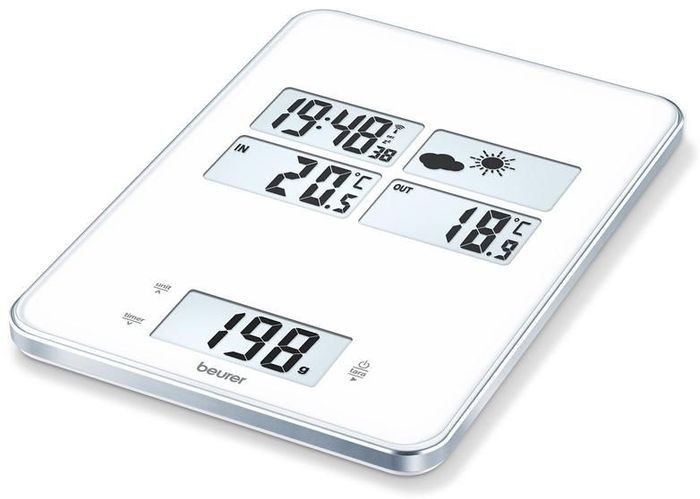 Beurer KS 80 Küchenwaage (5 in 1 Waage mit integrierter Wetterstation, Uhrzeit, Weckfunktion und Timer)