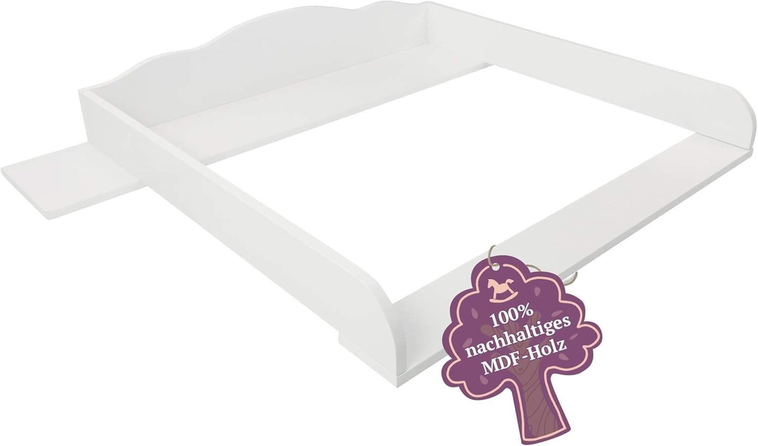 Unser Wickelaufsatz Linus im angesagten Wolken-Design, ist ein absolutes Must-Have für das Babyzimmer und den Wickelalltag. Der Aufsatz mit dem geschwungenen Rückteil ist für alle Kommoden mit einer Tiefe von 50 bis 51 cm und einer Länge von 108 cm, wie z.B. die bekannte IKEA Hemnes Kommode mit drei Schubladen geeignet. Dank der angebrachten Blende schließt der Wickelaufsatz mit der Wand und der Kommode ab und bietet eine zusätzliche Ablagefläche für Feuchttücher und kleine Wickelutensilien. Mit einer Liegefläche von 77x78 cm bietet der Wickelaufsatz viel Platz und Strampelfreiheit beim Wickeln. Unser Wickelaufsatz Wolke mit Blende lässt sich besonders gut mit unseren Wickelauflagen in den Maßen 77x76 cm, wie auch dem Wandregal und dem Babybett unserer Wolke-Kollektion kombinieren. ACHTUNG: Dieser Wickelaufsatz passt, auf alle IKEA Hemnes Kommoden, sowie alle Kommoden mit einer Tiefe zwischen 50 - 51 cm und einer Länge von 108 cm. Bitte beachte, dass die Farbgebung im Verhältnis zu der Lackierungen Ihre Kommode abweichen kann.