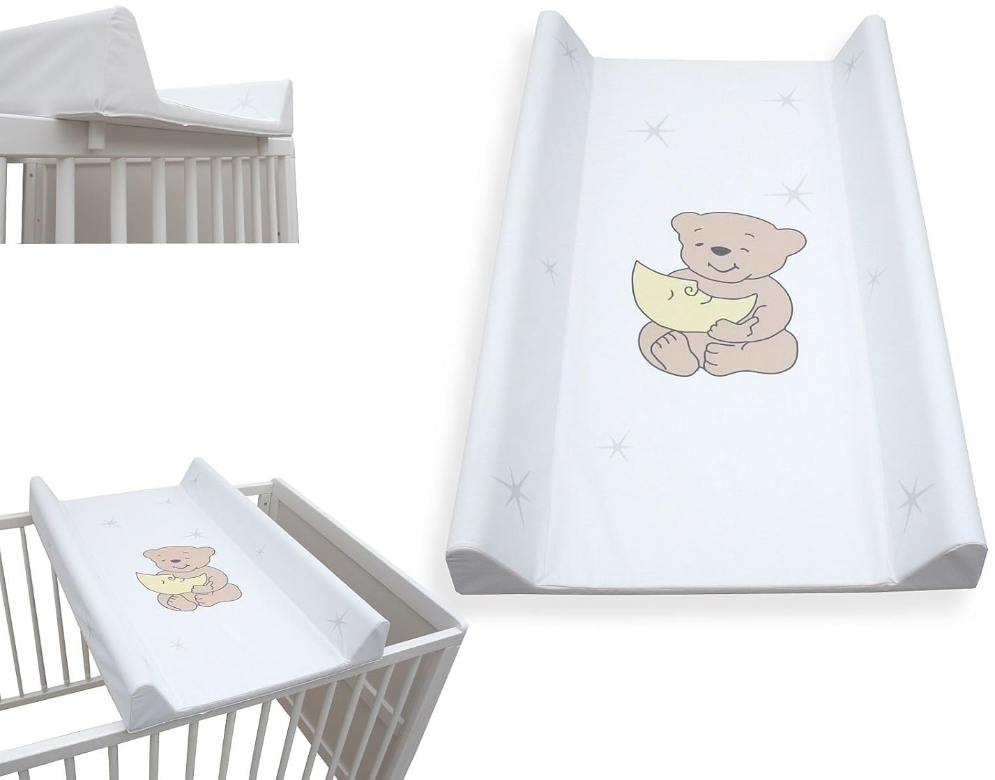 Micoland Wickeltisch ist eine praktische und platzsparende Lösung für das Wickeln Ihres Babys. Mit den Maßen 80x50 cm und einem stabilen Holzbrett in der Auflage eignet sich das Wickelbrett für Betten mit den Größen 120x60 cm, 140x70 cm sowie für Reisebetten. Der hohe Rand schützt das Köpfchen Ihres Babys, während die weiche Polsterung aus Schaumstoff für Komfort sorgt. Die 4 individuell einstellbaren Bodenstopper verhindern ein Verrutschen auf der Unterlage. **Highlights** - Maße: 80x50 cm - Hoher Rand schützt das Köpfchen Ihres Babys - Stabil durch eingearbeitetes Holzbrett - 4 Bodenstopper verhindern Verrutschen - Schadstoffgeprüft und phthalatfrei **Produkteigenschaften** - Geeignet für Betten 120x60 cm, 140x70 cm und Reisebetten - Leicht abwischbarer und hygienischer Folienbezug - Besonders weiche Polsterung (Schaumstoffkern) - Kann auf jeder Unterlage wie Tisch, Waschmaschine etc. verwendet werden - Ideale, kostengünstige Alternative zum Wickeltisch
