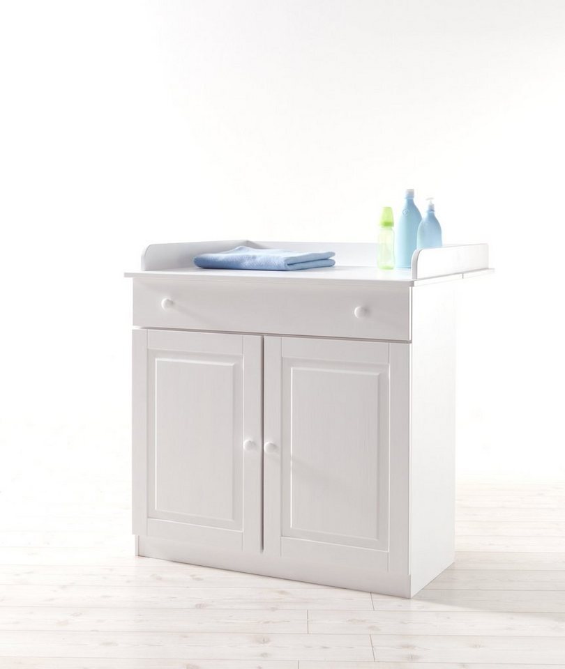 Beschreibung. Diese schöne Wickelkommode aus der Moritz Serie wurde aus massiver Kiefer gefertigt, bietet einen stabilen und sicheren Aufbau sowie einen Fallschutz, damit die Sicherheit deines Kindes gewährleistet ist. Eine Schublade sowie zwei große Fächer hinter den Türen bieten viel Stauraum für Kleidung und Accessoires. Besonderheiten. 1x große Schublade. 2x große Fächer hinter den Türen. Klassisches Design. Abmessungen*. Tiefe: 80 cm. Breite: 96 cm. Höhe: 90 cm. Material. Kiefer Massivholz. Lieferumfang. Kommode inkl. Wickelaufsatz. ohne Dekoration. *Alle Angaben sind Circa-Werte