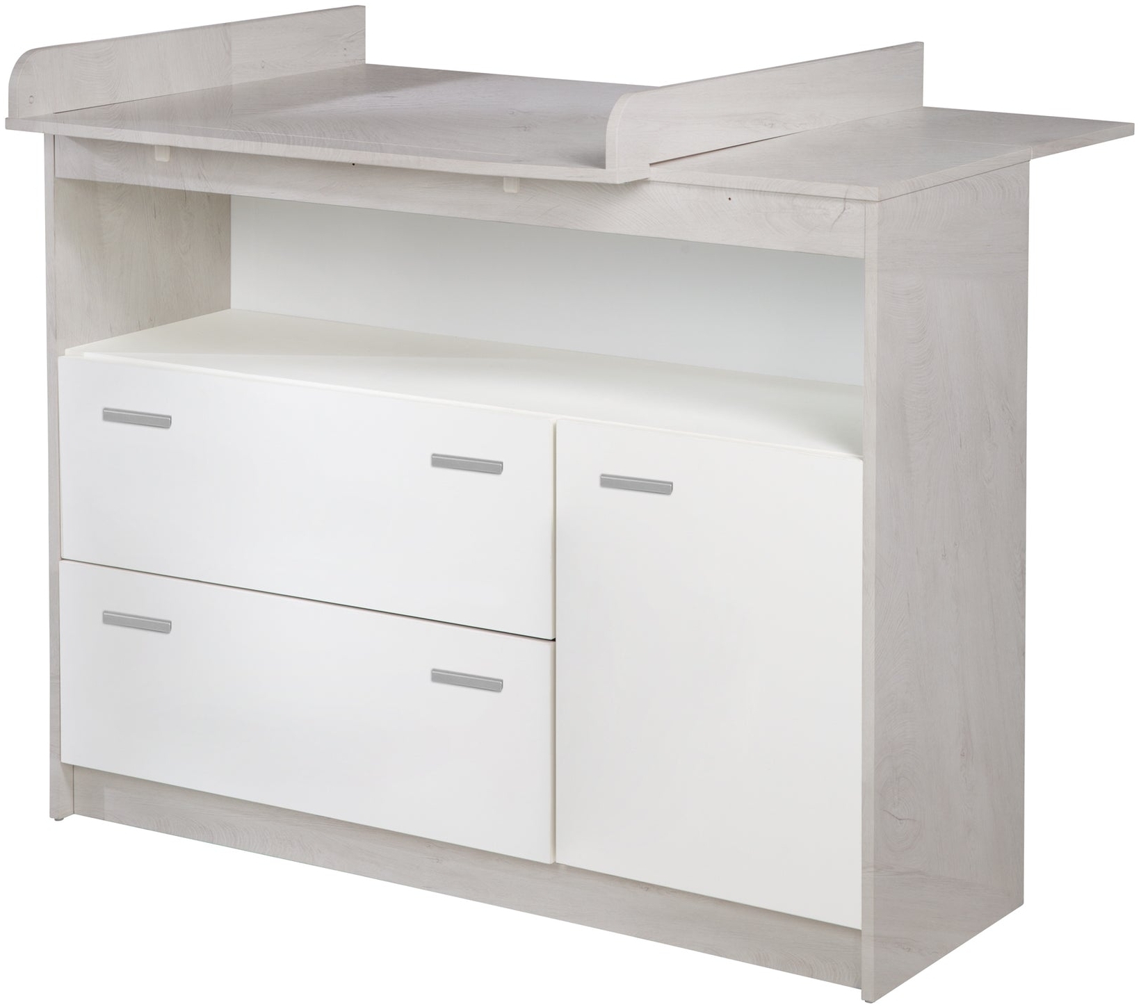 - Die Wickelkommode bietet zwei Schubladen und eine Tür für ausreichend Stauraum.