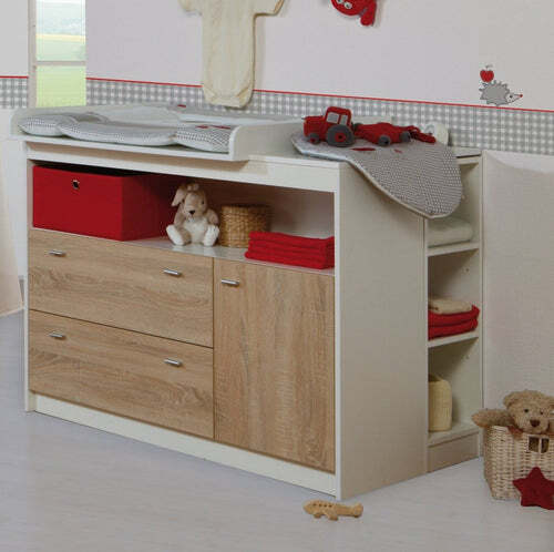 Die roba Wickelkommode „Gabriella“ bicolor, weiß / Eiche sägerau, mit abnehmbarem Wickelansatz macht mit ihrer rückenschonenden Wickelhöhe von 90 cm die Babypflege für Eltern und Baby zum Vergnügen. HxB: 98x117cm, Tiefe: mit/ohne Wickelansatz 75/39cm. Durch die geräumige und praktische Einteilung der breiten Kommode (1 Tür, 2 breite Schubladen, 1 großes offenes Fach) sind alle Wickelutensilien und Babysachen in greifbarer Nähe verstaut. Die breite Wickelkommode im klassischem Stil haben einen weißen Korpus und Fronten in einem weichen Eiche sägerau Ton. Die Kommode besteht aus melaminbeschichteter, strapazierfähiger Spanplatte. Die roba Wickelkommode mit Wickelansatz wächst von Geburt an mit. Für Ihr Kindergartenkind dient sie als erhöhter Sitzplatz, damit Sie in einer bequemen Stehposition mühelos beim Anziehen helfen können. Später lässt sie sich als Kommode im Jugend- oder Wohnzimmer verwenden. Die montagefreundliche Wickelkommode entspricht den aktuellen Sicherheitsstandards nach EN 12221 – 1+2:2008 + A1:2013. Alle verwendeten Materialien sind schadstoffgeprüft und aus nachhaltiger Forstwirtschaft. Mit weiteren Kindermöbeln der Serie „Gabriella“ lässt sich ein schönes Kinder- und Babyzimmer einrichten.