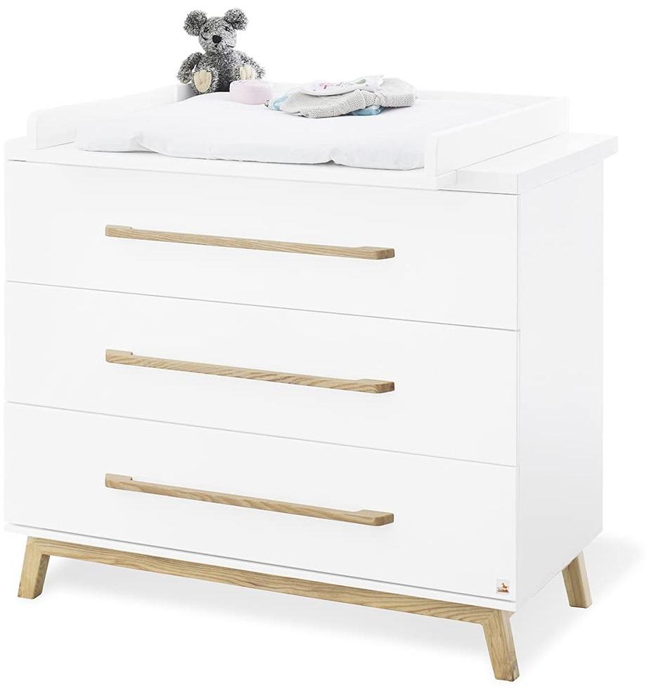 Die Wickelkommode 'Riva' von Pinolino bietet eine optisch ansprechende Lösung im skandinavischen Stil, um Ihrem Baby einen optimal ausgestatteten Wickelplatz zu schenken. Der Korpus ist aus MDF gefertigt und in der Farbe Weiß lackiert, Griffe und Füße sind aus massiven Eschenholz, das die moderne Optik der Kommode abrundet. Die Wickelkommode bietet eine Wickelfläche von 85x75 cm, die sich für alle gängigen Wickelauflagen eignet. Dank der komfortablen Wickelhöhe von 98 cm müssen Sie sich außerdem nicht tief bücken, wenn Sie Ihr Baby wickeln möchten. Dank der 3 Schubkästen bietet 'Riva' genügenden Platz und Verstaumöglichkeiten für alle Wickelaccessoires. Die Schubladen sind mit einem Soft-Close-System ausgestattet, das für ein leises und sicheres Schließen sorgt. Der Wickelaufsatz lässt sich wahlweise links, mittig oder rechts montieren. Einmal den Aufsatz abgenommen, können Sie die Wickelkommode von Pinolino auch als Kinderkommode weiterverwenden.