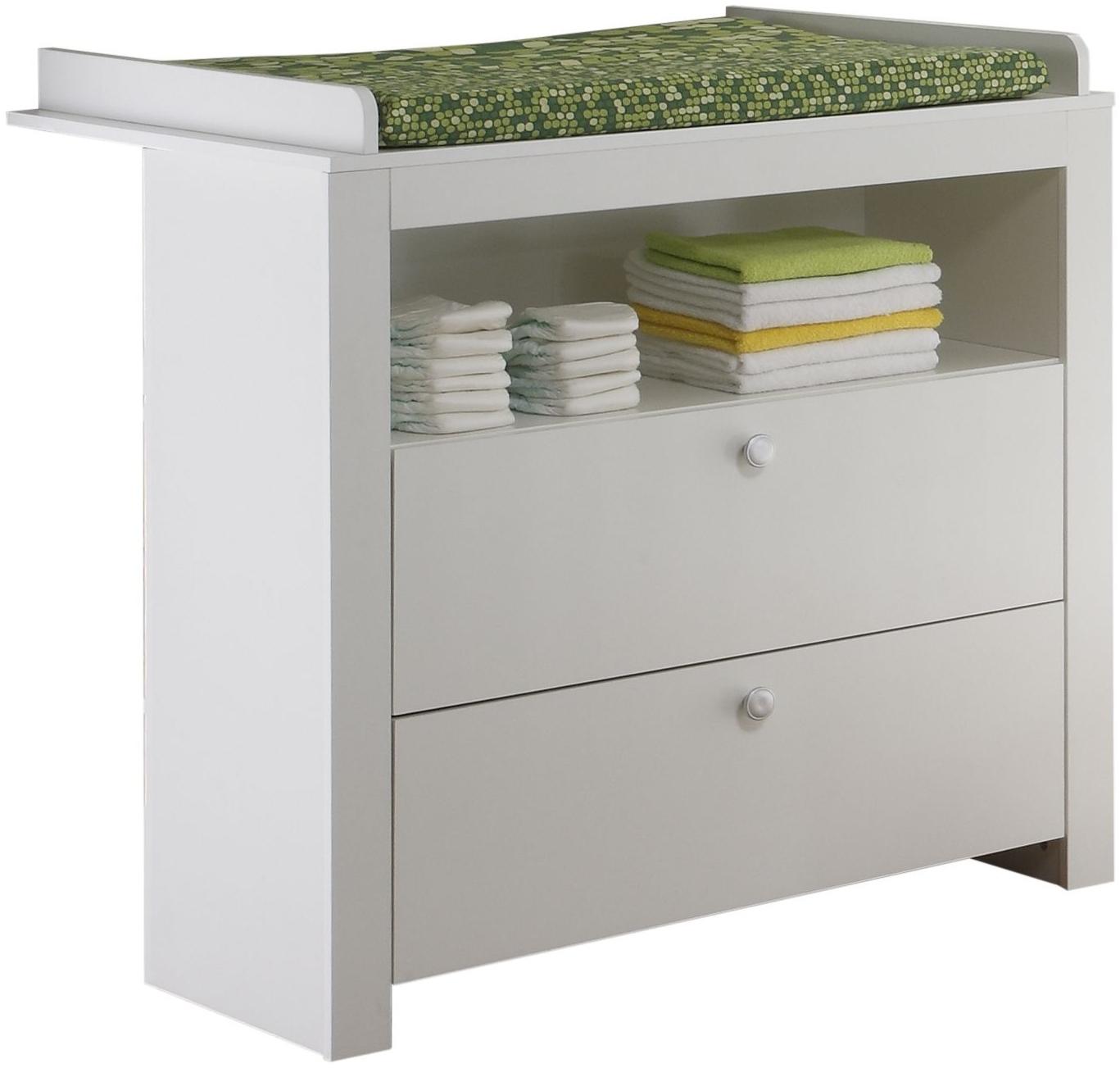Die praktische und modern gestaltete Babyzimmer Wickelkommode "Olivia" in weiß bietet Ihnen alles, was Sie zum Windeln und Wickeln Ihres Babys benötigen. Das Modell ist mit einer großzügig bemessenen Wickelfläche, zwei geräumigen Schubkästen sowie einem offenen Fach ausgestattet. Räumen Sie Windeln und Wäsche, Pflegeprodukte und kleines Spielzeug in die Ablagen und schon stehen Ihnen die Utensilien bei jedem Wechseln der Windeln zur Verfügung. Zum Öffnen und Schließen der Schübe dienen kleine Griffe in der Farbe weiß. Die Wickelauflage können Sie bei Bedarf abnehmen. Damit Ihr Kind weich und bequem liegt, statten Sie die Wickelauflage zusätzlich mit einem gepolsterten Kissen aus. Edle Fronten mit strapazierfähiger Beschichtung Babys erste Möbel müssen bestimmten Ansprüchen genügen. Sie sollten ausreichend Staufläche aufweisen, praktisch aufgeteilt und vor allem leicht zu reinigen sein. Die Wickelkommode "Olivia" ist mit einer strapazierfähigen Beschichtung aus besten Materialien versehen und dank der glatten Oberflächen leicht zu pflegen. Die Wickelkommode können Sie um weitere Kleinmöbel aus dem Programm Babyzimmer "Olivia" ergänzen.