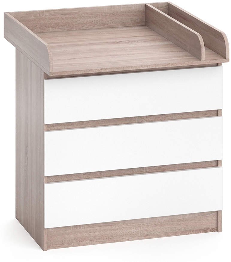 Die Wickelkommode Emma ist die perfekte Lösung für Eltern, die sich eine multifunktionale Kommode wünschen. Dank des praktischen Wickelaufsatzes lässt sich jeder Windelwechsel bequem und sicher durchführen. Doch damit nicht genug: Emma kann auch als Wohnzimmerschrank dienen oder im Kinderzimmer als normale Kommode genutzt werden. Die 3 Schubladen und das zusätzliche offene Regal auf beiden Seiten bieten ausreichend Stauraum für Kleidung, Windeln, Spielzeug und mehr. Das funktionelle Design macht Emma zu einem zeitlosen Möbelstück, das auch noch dann in jede Einrichtung passt, wenn das Kind längst erwachsen ist. Gönnen Sie sich und Ihrem Nachwuchs diesen Allrounder und profitieren Sie von jeder Menge Komfort und Flexibilität. --- **Technische Details:** **Farben:** Weiß, Sonoma **Abmessungen:** 80 x 87 x 48 cm (BxHxT) **Material:** Spanplatte, 16 mm **Oberfläche:** Melaminharzbeschichtung **Artikelgewicht inkl. Verpackung:** 43 kg. **Artikelgewicht:** 41.02 kg. --- LIEFERUMFANG: Wickelkommode (Stoffauflage nicht enthalten), Montageanleitung, Montagematerial. .