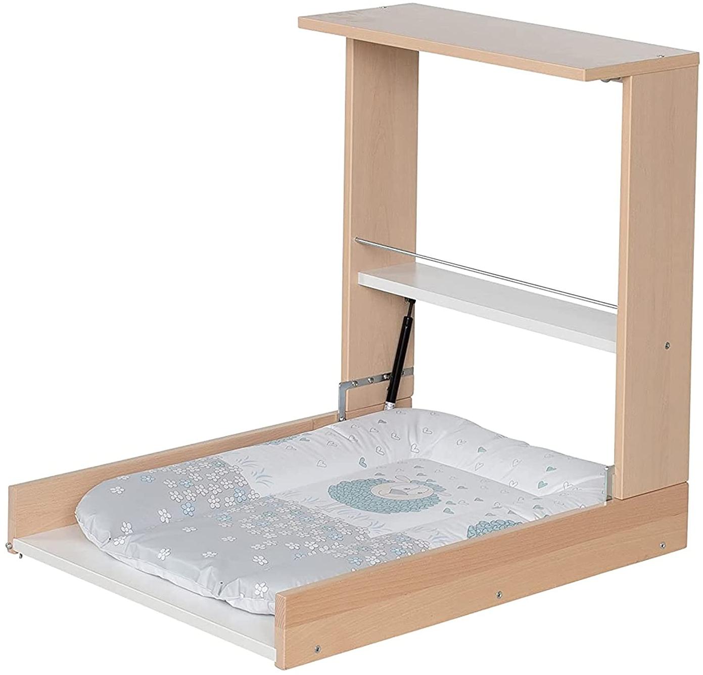 Mit dem Wand-Wickelregal Wicki von Geuther erhalten Sie ein platzsparendes Praxiswunder. Es vereinigt auf praktische Art und Weise die Vorteile von Regal und Wickeltisch. Wicki lässt sich ganz einfach mit einer Hand öffnen und schließen. Im zugeklappten Zustand hängt Wicki dezent an der Wand, ohne unnötigen Platz wegzunehmen. Egal ob Pflegeprodukte, Kleidung oder liebevolle Accessoires – hier können Sie alles optimal verstauen. Der heruntergeklappte Wickeltisch ist bis zu 11 kg belastbar und kann daher über die ersten Lebenswochen hinaus benutzt werden. Die im Lieferumfang enthaltene Wickelauflage ist in verschiedenen Designs verfügbar. Sie ist weich gepolstert und leicht zu reinigen. Produktdetails: Platzsparender Wickelplatz und Regal inklusive Wickelmulde Maße aufgeklappt: B 59 x H 71 x T75 cm Maße zugeklappt: B 59 x H77 x T23 cm Made in Germany