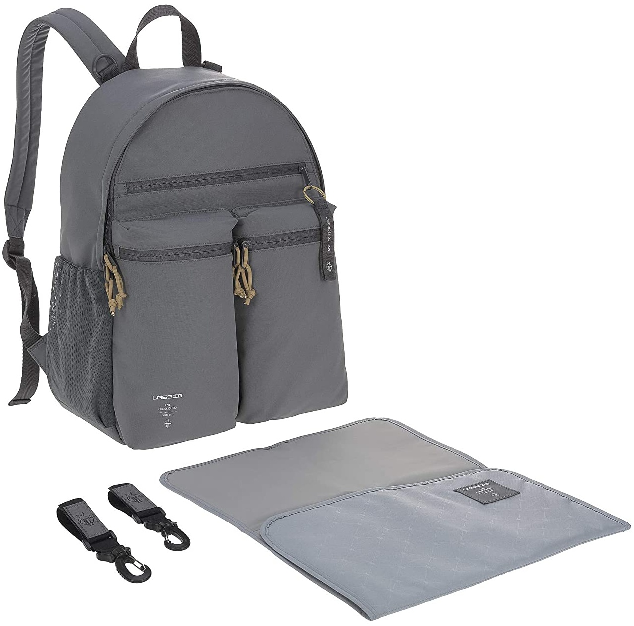 Lässig Wickelrucksack Urban Backpack Der Wickelrucksack Urban Backpack aus der Lässig Casual Kollektion ist der ideale Begleiter für Eltern, die es unterwegs gerne unkompliziert mögen. Dabei kommt der Wickelrucksack nicht nur in einem modernen Design, sondern auch mit einer Menge Stauraum und einer Vielzahl an praktischen Fächern. Einen schnellen Zugriff und guten Überblick auf das Innenleben hat man dank der großen Öffnung des Rucksacks. Seine zwei Außentaschen geben dem Urban Backpack seinen unverkennbaren Look. Und um Proviant länger frisch zu halten, entpuppt sich eine der beiden Fronttaschen als Isolierfach. Die Babyflasche findet dort sicher ihren Platz. Dank seiner gepolsterten Schultergurten werden auch längere Familienausflüge mit dem Urban Backpack zu einem entspannten Erlebnis. Ausgestattet mit einer wasserabweisenden Wickelunterlage, einer isolierten Fronttasche, einer Gläschenhalterung und einer Kinderwagenbefestigung hat man alles, was man unterwegs so braucht. Mit vielen verschiedenen praktischen Fächern, von innen sowie außen zugänglich, lassen sich alle wichtigen Utensilien durchdacht verstauen. Produkthighlights: • praktisches Wickelzubehör • durchdachter Stauraum • Vielzahl an Fächern • gepolsterte Schultergurte • große Öffnung des Rucksacks Technische Daten: • Innematerial: 100% Polyester • Außenmaterial: 100% Polyester • Abmessungen: 35 x 20 x 42 cm • Gesamtgewicht: 0,65 kg • Fassungsvermögen: 17,1 Liter