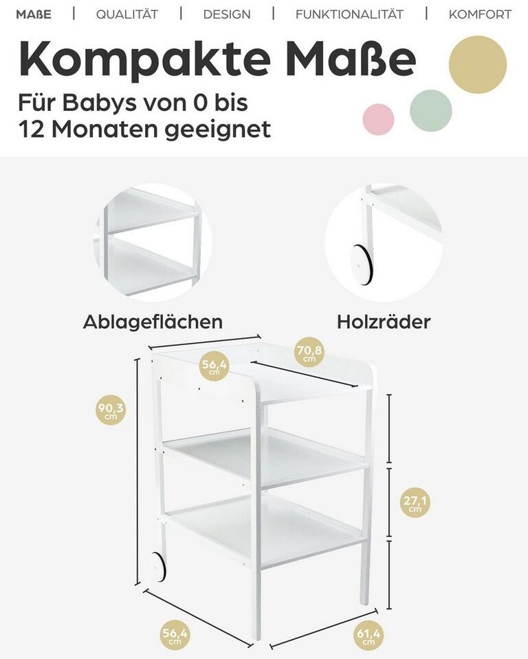 | Beschreibung | Das Geuther 4842XL Wickelregal Clarissa XL ist eine platzsparende Alternative zur klassischen Wickelkommode. Mit einer rückenschonenden Arbeitshöhe von 90 cm bietet es optimalen Komfort beim Wickeln. Das skandinavische Design passt perfekt ins Badezimmer oder in gastronomische Betriebe. Zwei geräumige Ablageflächen bieten ausreichend Stauraum für Pflegeprodukte. Das Wickelregal ist in Deutschland hergestellt und alle Farben und Lacke sind speichel- und schweißfest sowie schadstofffrei. Die Lieferung erfolgt zerlegt, die Montage ist schnell und einfach. **Highlights** - Rückenfreundliche Arbeitshöhe von 90 cm - Komfortable breite Wickelfläche von 56,4 cm - Erhöhte Seitenteile rund um die Wickelfläche - Zwei geräumige Ablageflächen - 2 Standfüße und 2 Holzräder sorgen für Mobilität **Produkteigenschaften** - Serie: Clarissa - Altersempfehlung: bis 12 Monate - Material: Holz - Max. Belastbarkeit: 11 kg - Abmessungen (LxBxH): 73,4 x 56,4 x 98,4 cm **Lieferumfang** - Zerlegtes Wickelregal - Montagematerial |