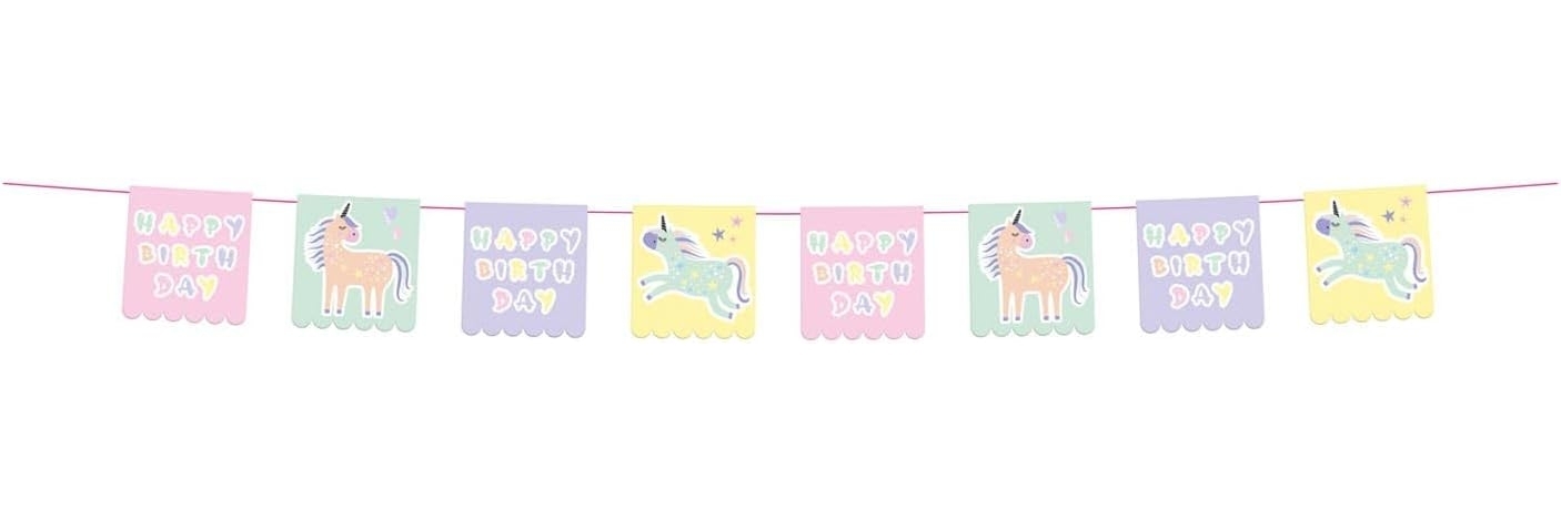 - Die Folat 68291 Wimpelkette hat ein fröhliches Motiv mit Einhörnern und Regenbögen.