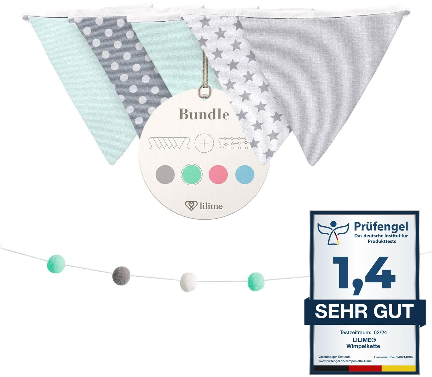 lilime® Wimpelkette Inkl. GRATIS Girlande ideal für Dekoration im Kinderzimmer - Unsere Wanddeko für dein Kind - Super süße Deko für jedes Babyzimmer (1. 9M/Grau-Weiß-Mint