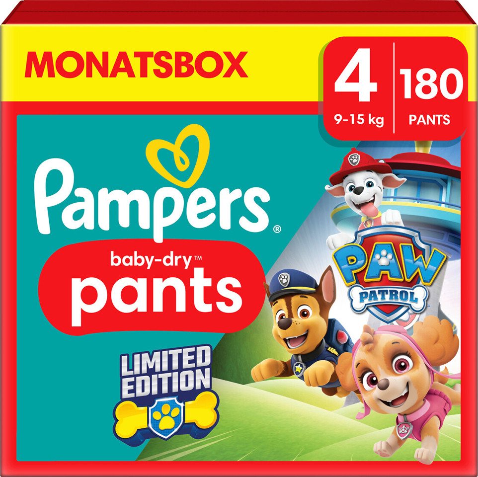 Pampers Windeln Baby Dry Pants Gr. 4 (9-15 kg) 180 St. Paw Patrol (Monatsbox, 180-St), dehnbarer Windelbund, elastische Beinbündchen, Limited Edition