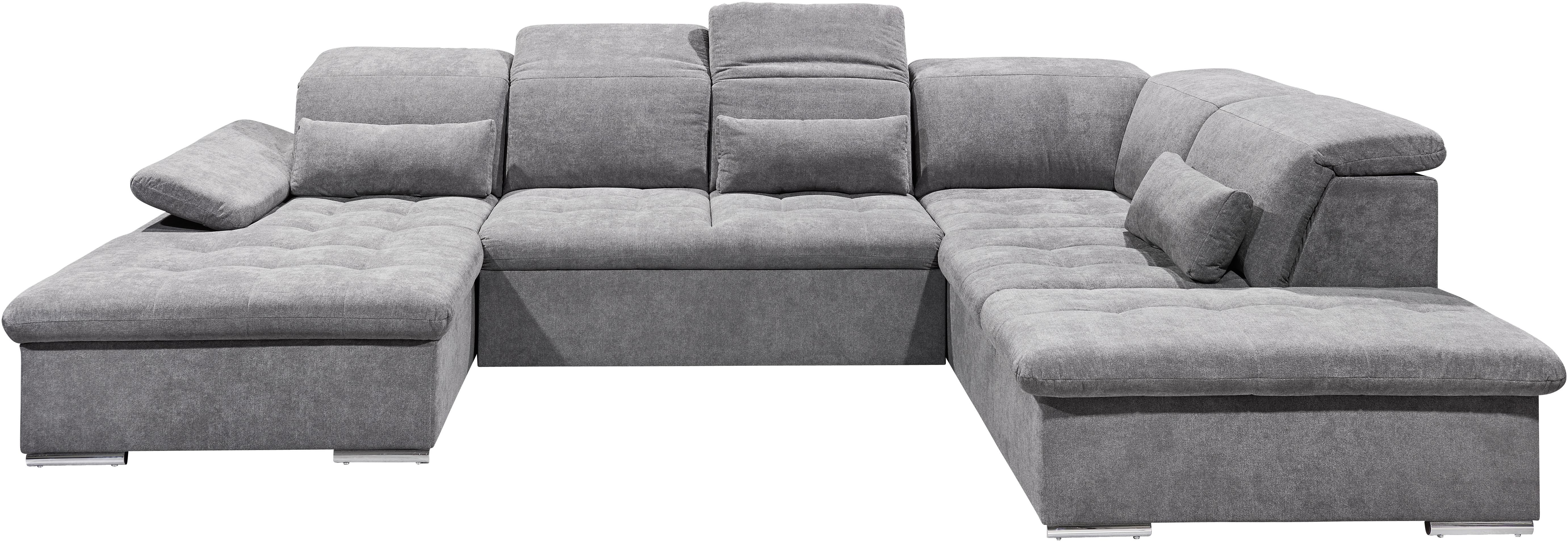 Funktionelle Wohnlandschaft aus der Serie Wayne in Stoff dark grey. Die Sitzpolsterung mit Nosagfedern ist sehr hochwertig und garantiert Ihnen einen sehr angenehmen Komfort. Schlaffunktion, Betkasten, Nierenkissen, Armteil- und Kopfteilverstellung sind inklusive und bieten Ihnen individuelle Einstellungen und Sitzpositionen. Der Rücken ist echt bezogen und daher im Raum frei stellbar. **Ausführung**: 1x Wohnlandschaft WAYNE U **Bezug:** Stoff Uran 03 dark grey (95% Polyester, 5% ylon) Grundgestell: Hochwertiges, stabiles Gestell aus Holzwerkstoffen Polsteraufbau Sitz: Nosagfederung Polsteraufbau Rücken: Schaumstoff Sitzfestigkeit: Mittel Füße: Kunststoff Chromoptik Inkl. Schlaffunktion Inkl. Bettkasten Inkl. Armteilverstellung Inkl. 5x Kopfteilverstellung Inkl. 3 Nierenkissen Rücken echt bezogen, daher Frei im Raum stellbar Zerlegte Ware - Eine bebilderte Aufbauanleitung für die Endmontage liegt bei! **Maße**: Stellmaß: ca. 188 x 340 x 240 cm Liegefläche: ca. 145x248 cm **Höhe:** ca. 98 cm **Sitzhöhe:** ca. 44 cm Sitztiefe: ca. 68 cm **Besonderheiten:** Inkl. Schlaffunktion! Inkl. Bettkasten! Inkl. Armteilverstellung! Inkl. Kopfteilverstellung! Inkl. Kissen! Inkl. Nosagfederung! **Lieferumfang:** Originalverpackte Neuware Angebot ohne Beimöbel und Dekoration