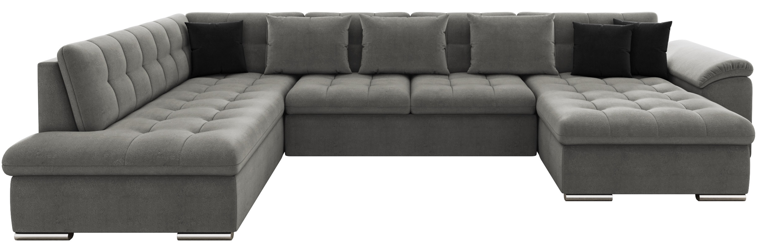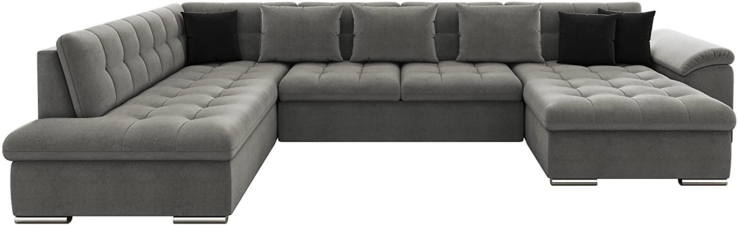 Gemütliches und elegantes Ecksofa 'Niko' in Grau / Schwarz, ideal für Ihren Wohnraum. Mit stabiler Holzkonstruktion und hochelastischem Schaumstoff bietet es sowohl Komfort als auch Funktionalität. Die Schlaffunktion und der Bettkasten machen es zu einer praktischen Wahl für Gästeübernachtungen. **Highlights** - Ausziehbares Ecksofa mit Schlaffunktion - Integrierter Bettkasten für zusätzlichen Stauraum - Freistehendes Design mit überzogenem Rücken - Hochwertige Materialien für Langlebigkeit - Kissen mit Reißverschluss im Lieferumfang enthalten **Produkteigenschaften** - Maße (LxBxH): 348 x 205 x 76 cm - Schlaffläche: 290 x 125 cm - Bettkasten Maße (LxBxH): 147 x 85 x 23 cm - Sitzfläche: Hochelastischer Schaumstoff + Wellenfeder - Holzkonstruktion + Spannplatte **Lieferumfang** - Ecksofa 'Niko' - Kissen mit Reißverschluss - Ohne Dekoration