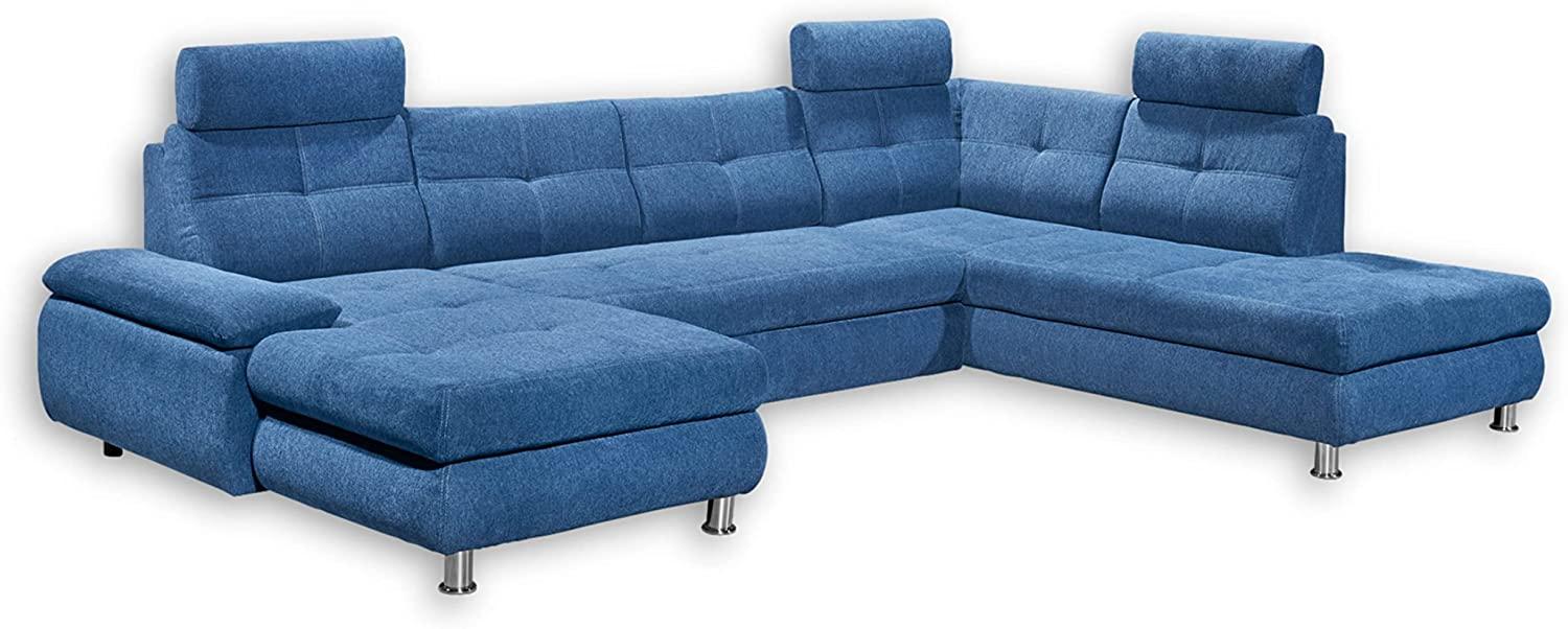 Wohnlandschaft mit Funktion ALBA. Stoff Brego 86, dark blue, 100% Polyester. Hochwertiges Holzwerkstoff-Gestell, Wellenunterfederung im Sitz, Schaumstoff im Rücken. Mittlere Sitzfestigkeit, silberfarbene Kunststofffüße. Echtstoff am Rücken, 1 Armteilverstellung, 3 variable Kopfstützen, Schlaffunktion, 1 Recamiere links, 1 Bettkasten, 1 Ottomane rechts/links bestellbar. **Highlights** - Armteilverstellung: Ermöglicht individuelle Anpassung - Schlaffunktion: Bietet zusätzlichen Schlafplatz - Bettkasten: Praktischer Stauraum für Decken und Kissen - Variable Kopfstützen: Für optimalen Komfort - Recamiere links: Flexibel platzierbar **Produkteigenschaften** - Bezug: Stoff Brego 86, dark blue, 100% Polyester - Polsteraufbau: Wellenunterfederung im Sitz, Schaumstoff im Rücken - Füße: Kunststoff, silberfarben - Ausstattung: Echtstoff am Rücken, 1 Armteilverstellung - Besonderheiten: 3 variable Kopfstützen, Schlaffunktion, 1 Recamiere links, 1 Bettkasten **Lieferumfang** 1 Wohnlandschaft ohne Dekoration