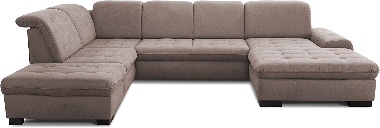 Das CAVADORE U-Form Sofa Lexi mit XXL-Longchair vereint hohen Sitzkomfort und Funktionalität. Der pflegeleichte Soft Clean Bezug in Hellbraun ist ideal für Familien mit Kindern und Haustieren. Mit Bettfunktion, Bettkasten, Stauraum und verstellbaren Kopfteilen bietet dieses Sofa alles, was Sie für entspannte Stunden benötigen. Die Maße betragen 329 x 82-99 x 224 cm (BxHxT). **Highlights** - Bettfunktion für Übernachtungsgäste - Bettkasten und zusätzlicher Stauraum - Verstellbare Kopfteile für individuellen Komfort - Pflegeleichter Soft Clean Bezug - Federkern für langlebigen Sitzkomfort **Produkteigenschaften** - Farbe: Taupe (Hellbraun) - Besonders geeignet für Haushalte mit Kindern und Haustieren - Maße: 329 x 82-99 x 224 cm (BxHxT) - Sitztiefe: 55 cm, Sitzhöhe: 41 cm, Sitzbreite: 256 cm - Liegefläche: 256 x 124 cm, Bettkasten: 152 x 48 x 16 cm, Stauraum: 78 x 48 x 16 cm - Füße: 6 cm **Lieferumfang** - Cavadore 5683 - Wohnlandschaft Lexi mit Federkern - Ottomane links, 2-Sitzer, XXL-Longchair rechts - Inkl. Bettfunktion, Bettkasten, Stauraum und Kopfteilverstellung - Füße: Buche Massiv Schwarz