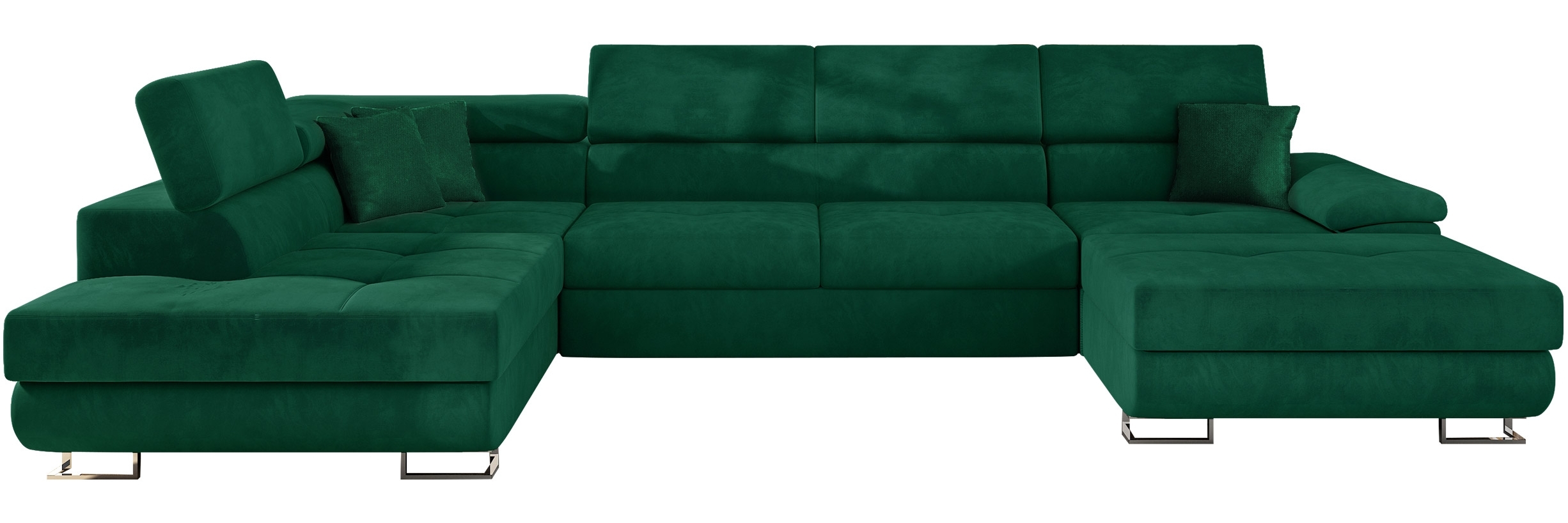 Die Wohnlandschaft Cotere Bis überzeugt durch ihr modernes Design und hohen Sitzkomfort. Mit einer Länge von 345 cm und einer Breite von 202 cm bietet sie ausreichend Platz für entspannte Stunden. Die Schlaffläche von 270 x 125 cm und der praktische Bettkasten machen sie ideal für Gästeübernachtungen. Die verstellbaren Kopfstützen und die weiche Sitzfläche sorgen für zusätzlichen Komfort. **Highlights** - Ausziehbares Ecksofa mit Schlaffunktion - Praktischer Bettkasten für zusätzlichen Stauraum - Verstellbare Kopfstützen für optimalen Komfort - Freistehendes Design mit echtem Bezug auf der Rückseite - Kissen mit Reißverschluss im Lieferumfang enthalten **Produkteigenschaften** - Maße (LxBxH): 345 x 202 x 71-91 cm - Schlaffläche: 270 x 125 cm - Bettkasten Maße (LxBxH): 174 x 92 x 18 cm - Sitzfläche: Holz-Konstruktion, Wellenfeder, Filz, Schaumstoff T-2844 (Dicke: 9 cm), Polsterwatte - Lehne: Holz-Konstruktion, Faserplatte, Schaumstoff T-2844 (Dicke: 7 cm), Polsterwatte - Vorderfüße: Metall Chrom, Hinterfüße: Kunststoff (Höhe: 9 cm) - Polsterlehnen fest montiert - Ecksofa des Typs "U" **Lieferumfang** - Wohnlandschaft Cotere Bis - Kissen (mit Reißverschluss) - Ohne Dekoration