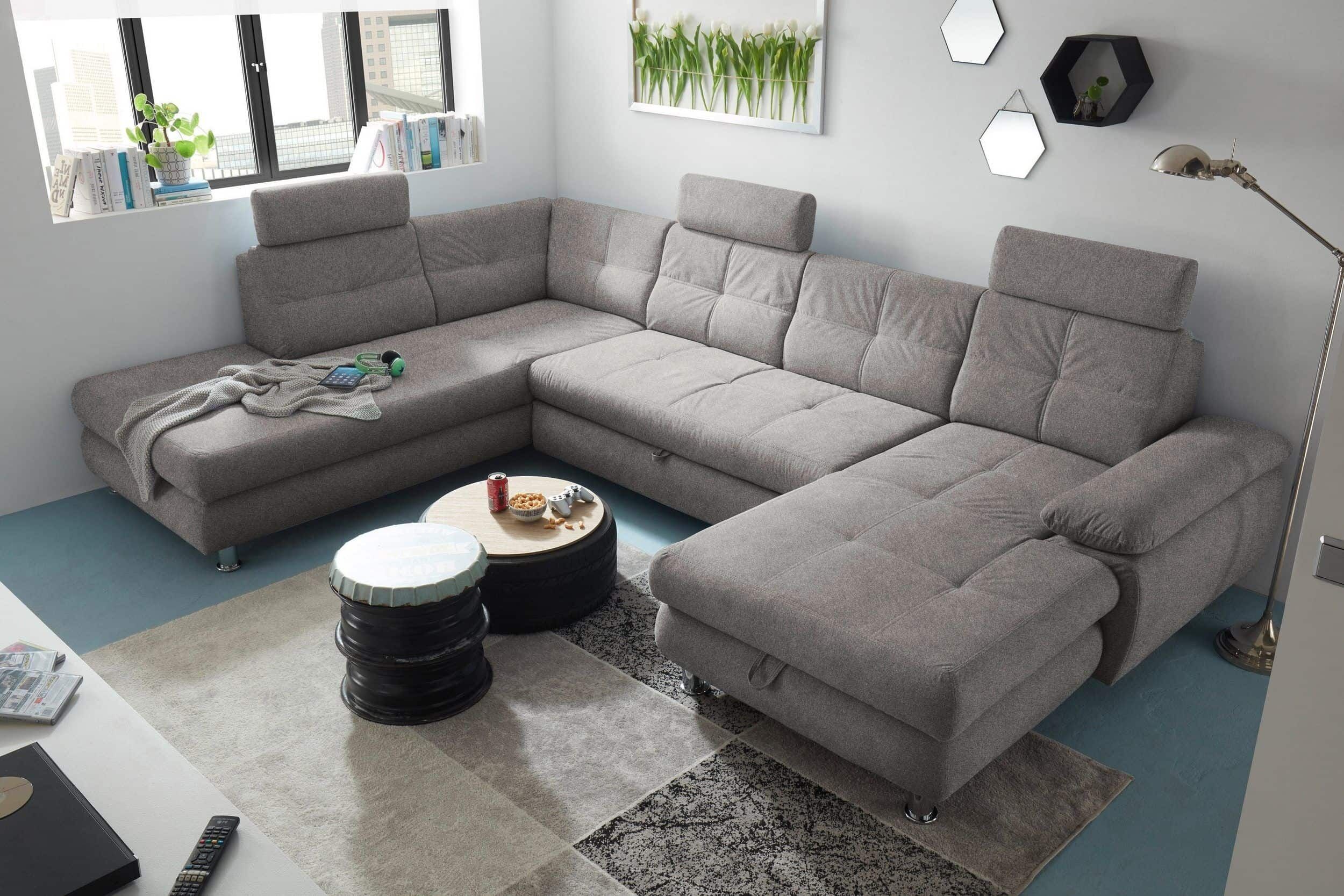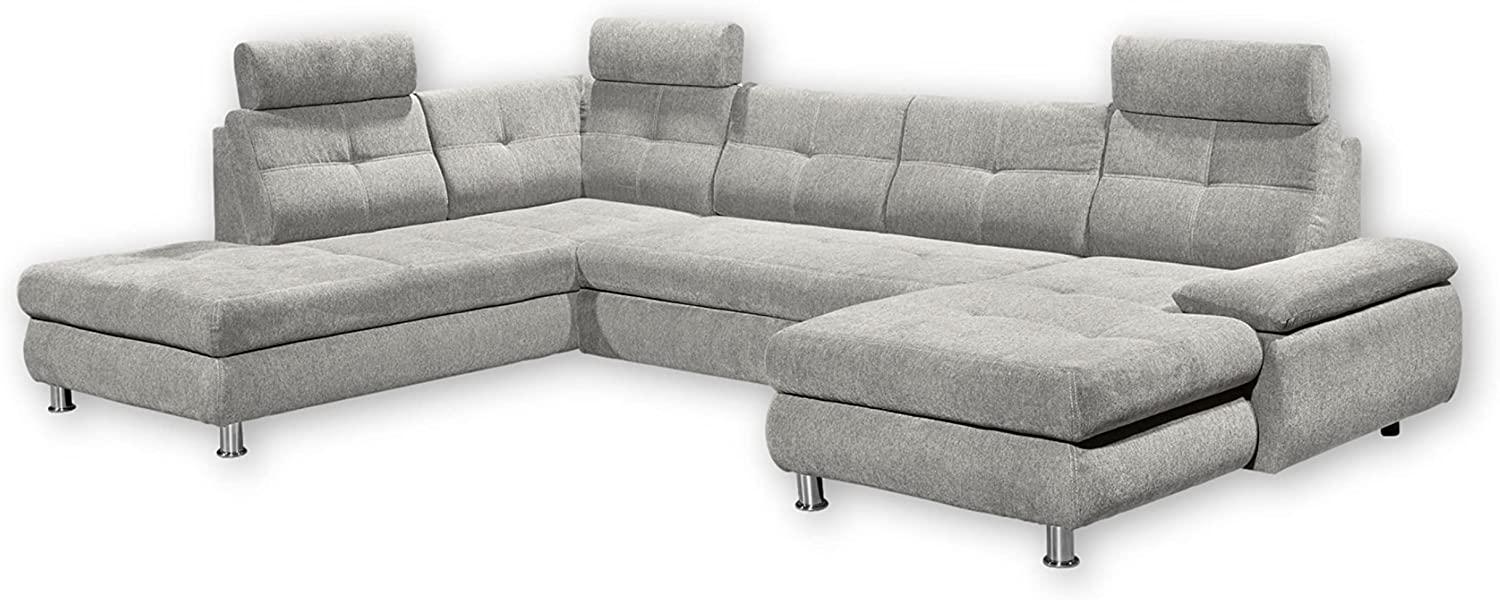 Die Stella Trading ALBA Wohnlandschaft in U-Form ist ein elegantes und komfortables Sofa, das mit einem strapazierfähigen und atmungsaktiven Stoffbezug in Silber überzeugt. Mit einer Größe von 349 x 88 x 233 cm (B/H/T) bietet sie ausreichend Platz zum Entspannen und Wohlfühlen. **Highlights** - Ausziehbare Liegefläche: Die Wohnlandschaft verfügt über eine praktische Schlaffunktion, die es Ihnen ermöglicht, im Handumdrehen einen bequemen Schlafplatz in der Größe 275x127 cm zu schaffen. - Bettkasten: Unter der Liegefläche befindet sich ein geräumiger Bettkasten, in dem Sie Bettwäsche und Kissen bequem verstauen können. - Bezogener Rücken: Der Rücken der Couchgarnitur ist echt bezogen, sodass Sie die Wohnlandschaft individuell im Raum aufstellen können, ohne sie zwingend an die Wand stellen zu müssen. - Leichte Montage: Die Wohnlandschaft ist dreiteilig aufgebaut und kann sowohl links als auch rechts bestellt werden. Die drei Kopfstützen sind variabel steckbar. **Produkteigenschaften** - Material: Strapazierfähiger und atmungsaktiver Stoffbezug in Silber - Maße: 349 x 88 x 233 cm (B/H/T) - Schlaffunktion: Liegefläche in der Größe 275x127 cm - Bettkasten: Aufklappbarer Bettkasten für die Aufbewahrung von Bettwäsche und Kissen - Bezogener Rücken: Echt bezogener Rücken für flexible Aufstellung im Raum - Leichte Montage: Dreiteiliger Aufbau, links oder rechts bestellbar, variabel steckbare Kopfstützen Die Stella Trading ALBA Wohnlandschaft in U-Form vereint Komfort, Funktionalität und ein ansprechendes Design. Mit ihrer ausziehbaren Liegefläche, dem praktischen Bettkasten und dem bezogenen Rücken ist sie die perfekte Wahl für Ihr Wohnzimmer.
