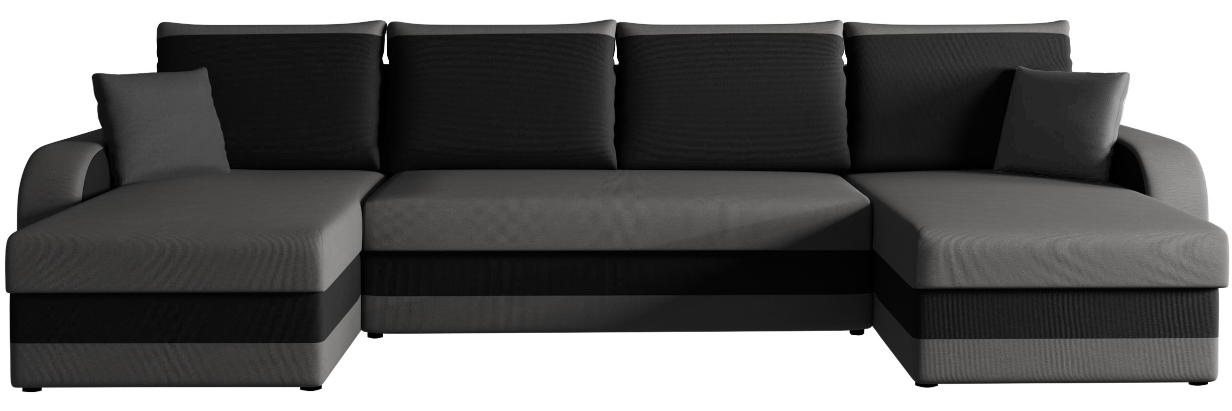 **Ecksofa Kristofer U** **Maße:** * Breite: 304 cm, * Tiefe: 140 cm, * Höhe: 80 cm, * Schlaffläche: 268x130 cm. Alle Maße sind ca. Maße **Lieferung:** * Ecksofas, Sofas und Sessel werden in die Wohnung gebracht. Die unkomplizierte Montage muss der Kunde selbst durchführen. Dies gilt nicht für Polsterbetten. * Geliefert wird nicht auf Insel und Bergbewohnung. **Farbkombination** * Die Farben unserer Grafik können vom Original abweichen. **Ausführung:** * Holzkonstruktion + Spanplatte, * Sitzfläche: Schaumstoff T2844 9cm + Polsterwatte, * ausziehbares Ecksofa, * mit zwei Bettkasten, * mit Schlaffunktion, * Plastikfüße, * Polsterlehnen fest montiert, * Kissen sind im Preis enthalten (3 Rückenkissen + 2 Zusätzliche), * Die großen Kissen mit Reißverschluss ausgestattet, * Aufklappbare Lehnen mit Stoff vom Korpus bezogen, * Freistehendes Ecksofa (Rücken auch überzogen) **Zusatzinformation:** * Ohne Dekoration.