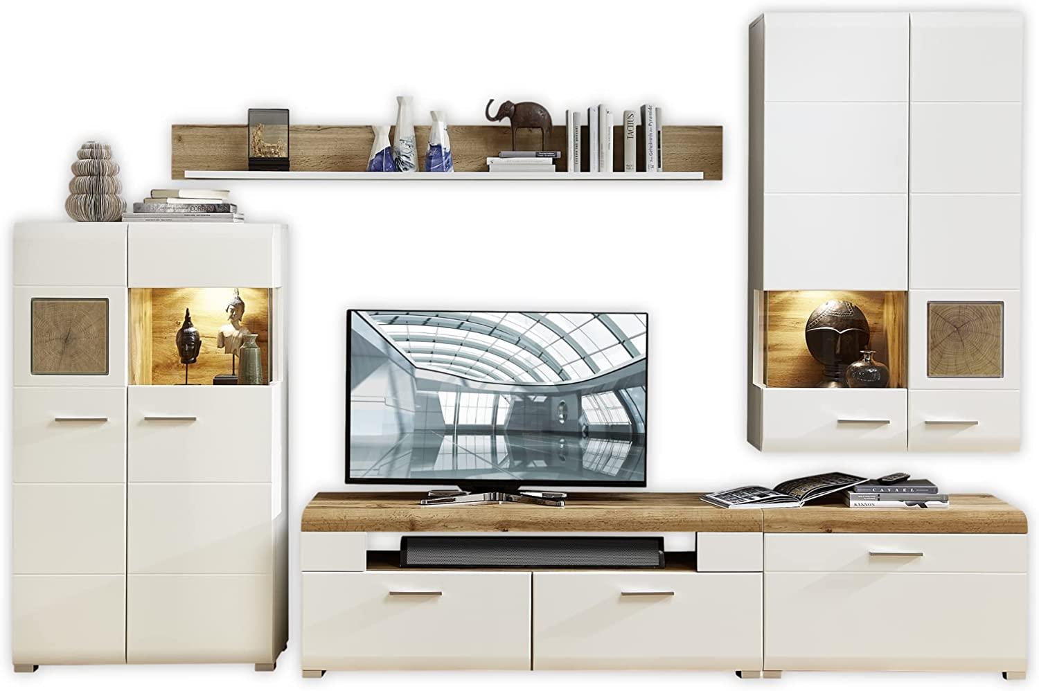 Moderne Wohnwand Friedberg aus dem Programm FUN PLUS in elegantem Weiß. Diese Wohnwand überzeugt durch ihre Absetzungen aus Hirnholz und bietet großzügigen Stauraum. TV-Geräte bis zu 55 Zoll finden hier Platz. Die integrierte LED-Beleuchtung setzt Ihre Habseligkeiten perfekt in Szene. Die Kombination aus weißem MDF und Eiche Altholz sorgt für einen harmonischen Kontrast in Ihrem Wohnzimmer. **Highlights** - Inklusive LED-Beleuchtung für eine stimmungsvolle Atmosphäre - Softclose-Funktion für sanftes Schließen der Türen - Hochwertige Materialien: MDF und Eiche Altholz - Platz für TV-Geräte bis zu 55 Zoll - Einfache Montage dank detaillierter Anleitung **Produkteigenschaften** - Maße (B/H/T): ca. 320 x 205 x 47 cm - Vitrine (B/H/T): ca. 80 x 139 x 37 cm - Hängevitrine (B/H/T): ca. 80 x 136 x 37 cm - TV-Board (B/H/T): ca. 140 x 51 x 47 cm - Unterteil (B/H/T): ca. 80 x 51 x 47 cm - Wandboard (B/H/T): ca. 180 x 18 x 22 cm - Material: Holzspanwerkstoff, MDF, Eiche Altholz, Klarglas - Griffe: Metall, Chrom matt - Füße: Kunststoff, eckig - Zerlegte Ware mit bebilderter Aufbauanleitung **Lieferumfang** - 1x kleine Vitrine - 1x Hängevitrine - 1x TV-Unterteil - 1x Unterteil - 1x Wandboard - Montage-Material - Angebot ohne Beimöbel und Dekoration