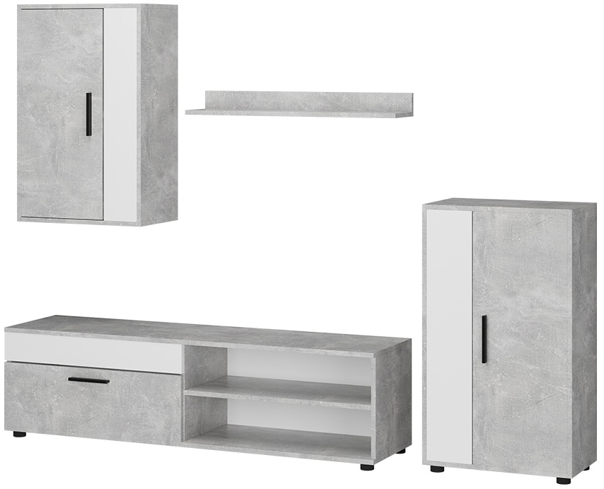 - Sie ist in der Farbe Beton-Weiß erhältlich und umfasst ein Lowboard, einen Hängeschrank, einen Schrank und ein Regal.