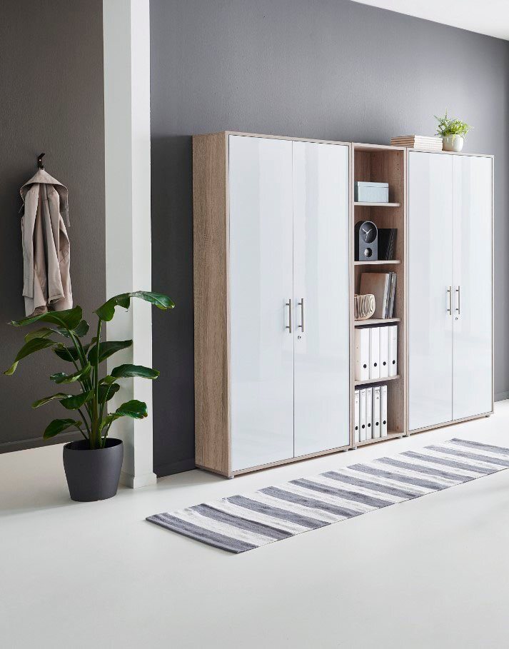 Das Büro-Set „Tabor“ von BMG Möbel überzeugt durch sein zeitloses Design und die Hochglanz-Fronten. Es bietet viel Stauraum mit zwei abschließbaren Aktenschränken und einem offenen Aktenregal. Die höhenverstellbaren Einlegeböden ermöglichen eine individuelle Anpassung der Fachgrößen. Die Möbel bestehen aus beschichteten Holzwerkstoffen, die pflegeleichte Oberflächen bieten. Elegante Bügelgriffe aus Metall und Anschlagsdämpfer für leises Schließen runden das Gesamtbild ab. **Highlights** - Hochglanz-Fronten für eine moderne Optik - Abschließbare Drehtüren für Sicherheit - Höhenverstellbare Einlegeböden für flexible Nutzung - Pflegeleichte Oberflächen aus beschichteten Holzwerkstoffen - Made in Germany für hohe Qualität **Produkteigenschaften** - Set bestehend aus 2 hohen Aktenschränken und 1 hohem Aktenregal - Griffe aus Edelstahl - Metallschlösser - ABS-Kanten **Lieferumfang** - 2 x hoher Aktenschrank - 1 x hohes Aktenregal - Ausschluss von optionalem Zubehör