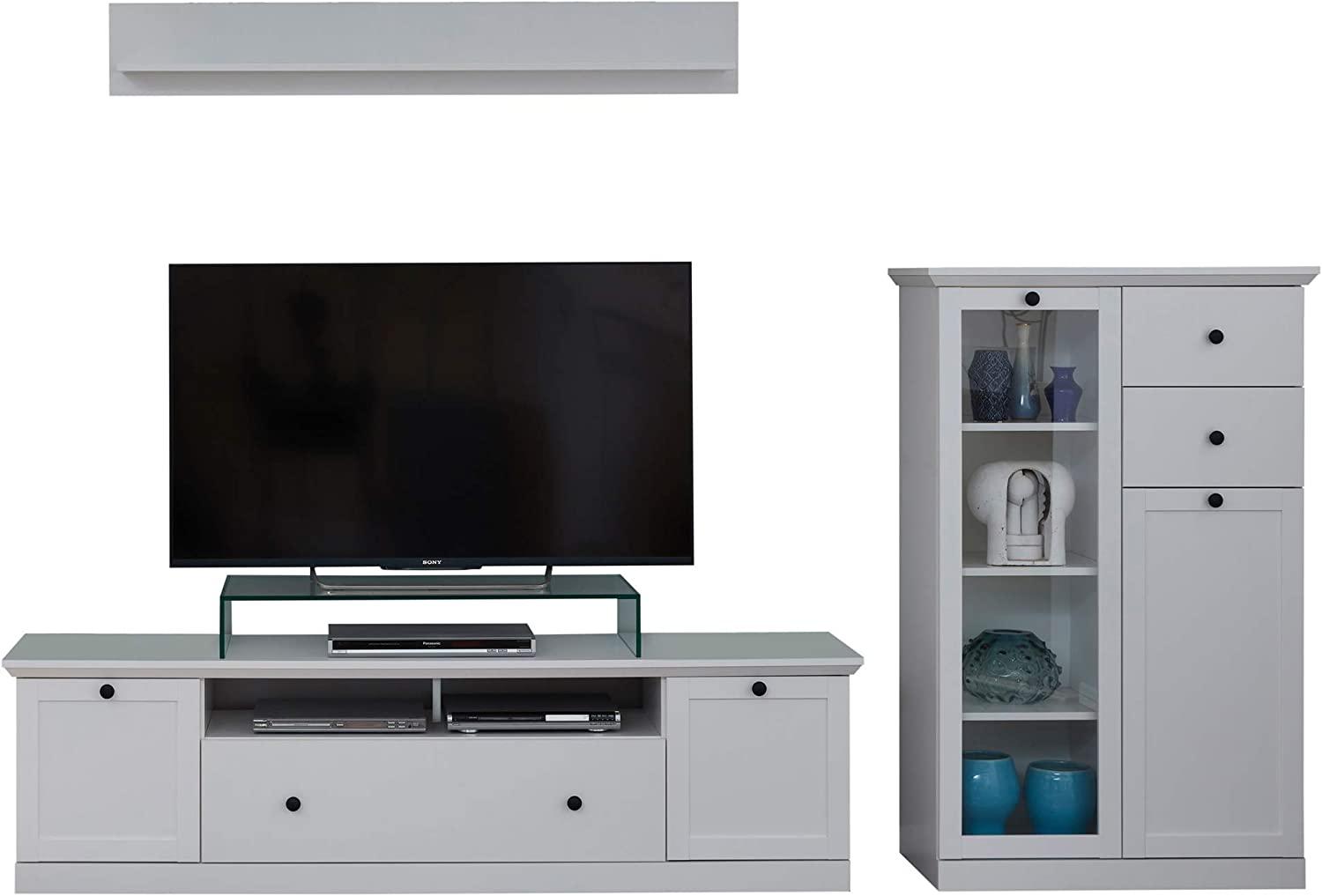 Die Wohnwand Baxter in elegantem Weiß kombiniert modernen Landhausstil mit praktischen Stauraummöglichkeiten. Mit einem Gesamtmaß von ca. 273 cm in der Breite, 180 cm in der Höhe und 41 cm in der Tiefe bietet sie ausreichend Platz für Ihre Utensilien und eine stilvolle Präsentation Ihrer Dekorationen. Die strapazierfähige Melamin-Oberfläche sorgt für Pflegeleichtigkeit und Langlebigkeit. **Highlights** - Moderner Landhausstil: Verleiht Ihrem Wohnraum eine zeitlose Eleganz. - Strapazierfähige Beschichtung: Langlebig und pflegeleicht durch glatte Oberflächen. - Viele Vitrinenfächer: Ideal für die Präsentation Ihrer Dekorationen. - Geschlossener Stauraum: Bietet ausreichend Platz für Ihre Utensilien. - Schubkästen mit Unterflurführung: Einfach herausnehmbar für eine unkomplizierte Reinigung. **Produkteigenschaften** - Gesamtmaß B/H/T: ca. 273 x 180 x 41 cm - Wandboard B/H/T: ca. 139 x 21 x 18 cm - TV-Lowboard B/H/T: ca. 177 x 49 x 41 cm - Vitrine/Highboard B/H/T: ca. 81 x 129 x 41 cm - Metallgriffe in altsilberfarben - Metallscharniere und Metallschienen kugelgelagert - Energieeffizienz LED-Beleuchtung: Wert G **Lieferumfang** - Zerlegt/Selbstmontage, inkl. bebilderte Aufbauanleitung - Montage- und Befestigungsmaterial - Telefonische Terminabsprache für die Lieferung bis in die Wohnung - Dekoration und Elektrogeräte nicht enthalten