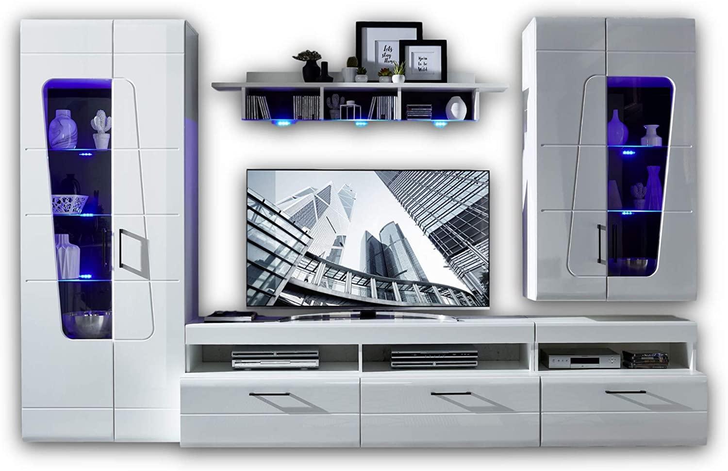 Mit der Wohnwand Stuttgart zieht moderner Chic in Ihre vier Wände ein. Vor allem die im Lieferumfang enthaltene LED-Beleuchtung setzt Maßstäbe und taucht Ihr Wohnzimmer in besonders attraktives Licht. Gleichzeitig stellen die einzelnen Möbel des Ensembles viel zusätzlichen Stauraum zur Verfügung. Tatsächlich ist die Wohnwand Stuttgart aber auch ohne Beleuchtung ein echter Glanzpunkt. Besonders die MDF-Fronten in weißer Hochglanzoptik sind ein attraktiver Blickfang. Noch mehr Aufmerksamkeit gewinnt die Anbauwand Stuttgart durch die markanten Strukturen auf der Vorderseite und die asymmetrische Anordnung der Glaselemente. Hinter den teils transparenten Türen haben Sie ausreichend Platz zur Verfügung, um Ihre Deko und Accessoires optimal zu präsentieren. Schwarze Rückwände rücken diese noch effektiver in den Fokus. Übrigens ist nicht nur die Betrachtung Ihrer neuen Wohnwand ein Genuss, auch beim Betätigen der insgesamt vier Türen und drei Schubladen profitieren Sie von gedämpften Scharnieren und einer Soft-Close-Funktion. Dies schont nicht nur Ihre Nerven, sondern gleichzeitig das Material. Freuen Sie sich also auf eine langjährige Nutzung der Anbauwand Stuttgart.