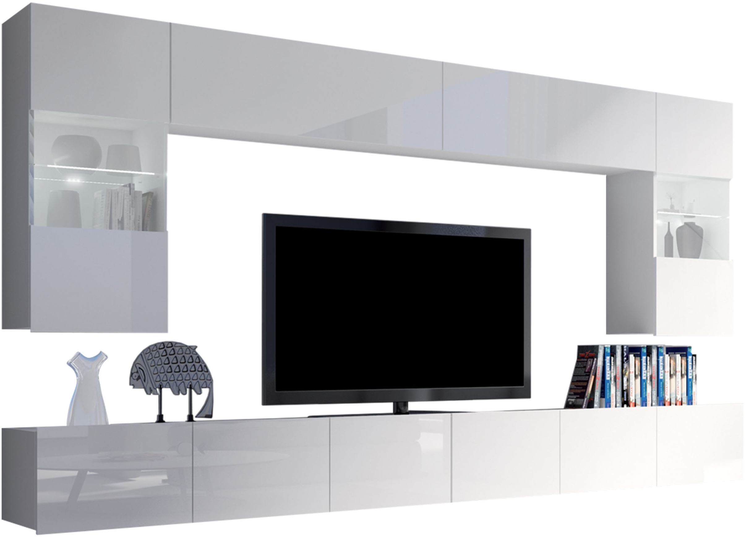 Wohnwand Calabrini I (Farbe: Weiß / Weiß Hochglanz, mit weißer LED Beleuchtung)