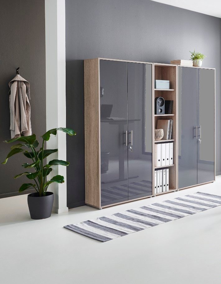 Das Büro-Set „Tabor“ von BMG Möbel überzeugt durch sein zeitloses Design und die eleganten Hochglanz-Fronten. Es bietet viel Stauraum mit zwei abschließbaren Aktenschränken und einem offenen Aktenregal. Die Türen sind mit Anschlagsdämpfern ausgestattet, was eine leise Bedienung ermöglicht. Die höhenverstellbaren Einlegeböden bieten Flexibilität für die Unterbringung von Aktenordnern und Büromaterial. Die pflegeleichten Oberflächen aus beschichteten Holzwerkstoffen runden das Gesamtbild ab. **Highlights** - Hochglanz-Fronten für eine elegante Optik - Abschließbare Drehtüren für Sicherheit - Anschlagsdämpfer für leises Schließen der Türen - Höhenverstellbare Einlegeböden für individuelle Anpassung - Pflegeleichte Oberflächen aus beschichteten Holzwerkstoffen **Produkteigenschaften** - Set bestehend aus 2 Aktenschränken und 1 offenen Aktenregal - Material: beschichtete Holzwerkstoffe - Elegante Bügelgriffe aus Metall **Lieferumfang** - 2 x Aktenschrank mit abschließbaren Drehtüren - 1 x offenes Aktenregal - Exklusive Dekoration und Büromaterial