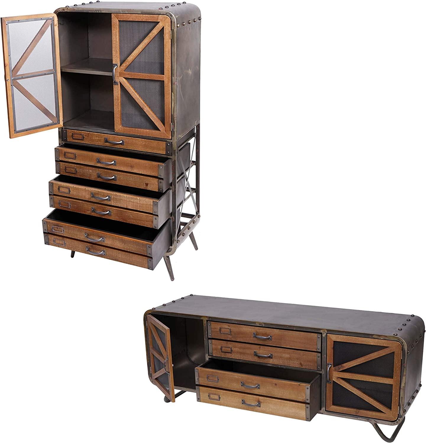 - Lieferumfang: 1x TV Rack, 1x Hochschrank - Industrie-Design - Viel Stauraum - Mit Metallgitter - TV-Rack mit zwei großen Schubladen und Zierschild - Mit Ziernieten - Schrank mit vier Schubladen und Zierschild - Jeweils zwei Staufächer mit Tür - Dieses Set aus TV-Schrank und Hochschrank im Industrie-Design ist in Ihrem Wohnzimmer ein echter Blickfang. Mit der Materialkombination aus Metall und Tannenholz setzen die Kommode und der Wandschrank extravagante Akzente in Ihren heimischen vier Wänden. - Sie sind ein Freund von Ordnung? Das rustikale Side- und Highboard im Industrial-Look sind nicht nur optisch ansprechend, sondern verfügen auch über reichlich Stauräume für optimale Aufbewahrungsmöglichkeiten. **Maße TV-Rack (HxBxT) (ca.):** Gesamt: 55 x 139 x 41 cm Staufach: 41 x 35 x 39 cm Schublade: 18 x 58 x 38 cm Maße Schrank (HxBxT) (ca.): Gesamt: 128 x 60 x 33 cm Schrankfach oben: 29 x 56 x 30 cm Schrankfach unten: 26 x 56 x 30 cm Obere Schublade: 6 x 54 x 30 cm Untere Schubladen: 13 x 54 x 30 cm **Material:** Gestell: Metall Türen: Tannenholz Das Schrank-Set bringt durch seine einzigartige Aufmachung mit seinen Ziernieten nicht nur einen antiken Charme in Ihre Räumlichkeiten, sondern bietet zum anderen auch ausreichend Unterbringungsmöglichkeiten. Das von Holz umrandete Metallgitter an den Türen verleiht dem Schubladenschrank und dem Lowboard zusätzlich noch das gewisse Extra. Der Wohnzimmerschrank verfügt über vier geräumige Schubladen, die durch die raffinierte Vorderoptik von außen wie sieben Stück aussehen, zudem besitzt er ein großes Staufach mit Einlegeboden. Ebenso verhält es sich mit den zwei Schubladen des Fernsehtisches. Dieser besitzt außerdem zwei praktische Fächer mit Tür. Alltägliche Gebrauchsgegenstände wie zum Beispiel Zeitschriften, Spielekonsolen, Fernbedienungen und Ähnliches können Sie kinderleicht unterbringen. Dank des Industrie-Looks macht dieses Set nicht nur eine gute Figur in Ihren heimischen vier Wänden, sondern es passt genauso gut in ein Café, Bar oder Restaurant und sorgt für eine besondere Atmosphäre. Bestellen, auspacken, fertig - alle Produkte dieser Serie werden fertig montiert geliefert, sodass der lästige Aufbau komplett entfällt. Das Rundum-sorglos-Paket. Nach Übergabe an den Spediteur Zustellzeit bis zu einer Woche. Der Spediteur bekommt den Auftrag, mit Ihnen einen Anlieferungstermin zu vereinbaren. Eine Anlieferung erfolgt, wie üblich, immer frei Bordsteinkante - ein Transport in die Wohnung oder ein Aufbau der Ware ist NICHT beinhaltet. Bitte kontrollieren Sie die Ware bei Annahme. Etwaige Mängel vermerken Sie bitte detailliert im Lieferschein. Wir versuchen dann, Ihnen schnellstmöglich ein Ersatzteil zuzusenden oder eine Minderung auszubezahlen. Verweigern Sie bitte niemals die Annahme.