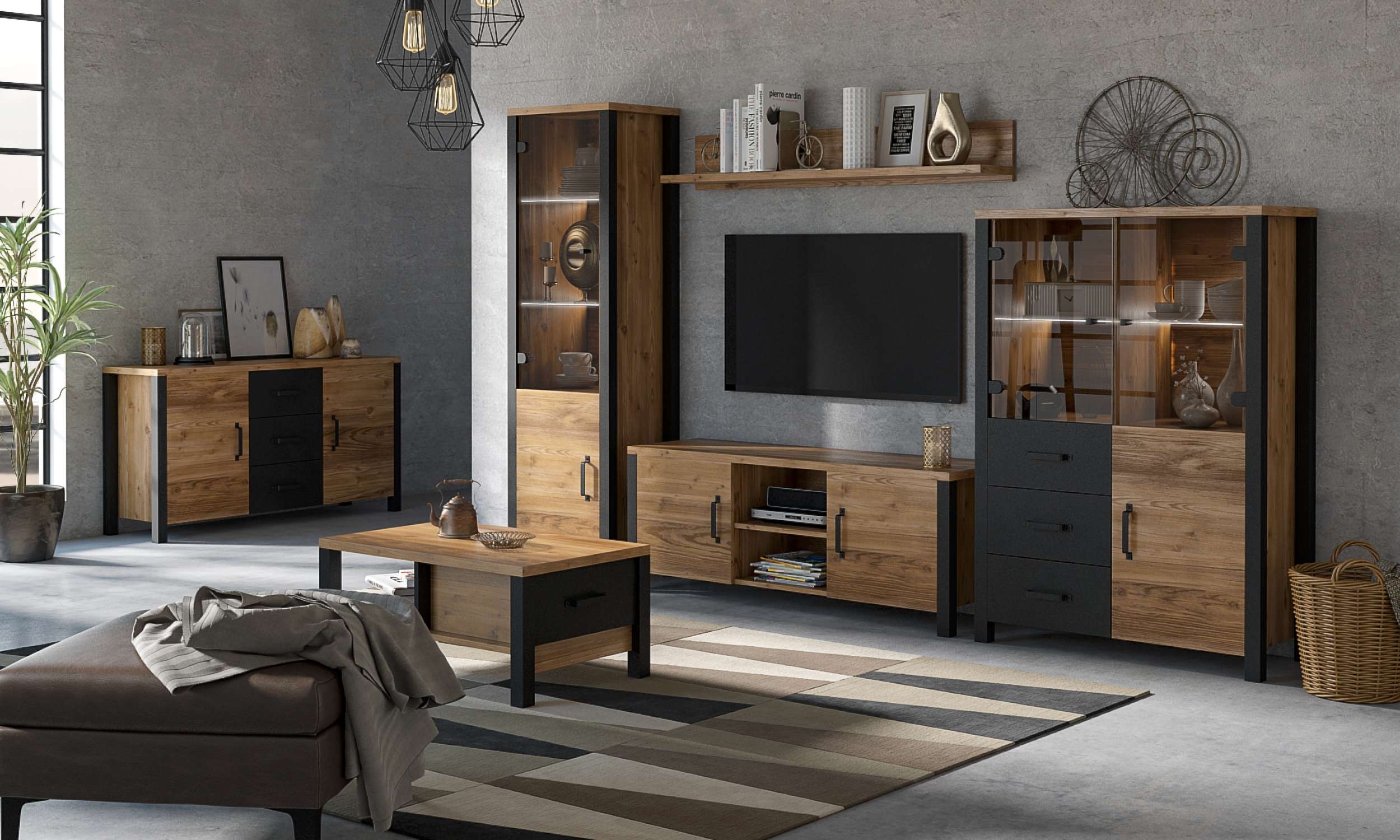 Produktmaße 1 x Wandboard: ( H x B x L ) 22 x 24 x 147 cm 1 x Standvitrine: ( H x B x T ) 191 x 56 x 43 cm 1 x Kommode: ( H x B x T ) 79 x 147 x 43 cm 1 x Lowboard: ( H x B x T ) 57 x 147 x 43 cm 1 x Standvitrine: ( H x B x T ) 146 x 101 x 43 cm 1 x Couchtisch: ( H x B x L ) 42 x 56 x 90 cm Details Design: Industrial Korpus & Front: Spanplatte, foliert Griffe: Kunststoff Gestell: Quadratische Füße LED-Beleuchtung: LED-Beleuchtung des Einsatzes inklusive Eigenschaften: Hochwertige Verarbeitung aus FSC-zertifiziertem Holzwerkstoff, bietet viel Platz und Abstellfläche, Einzelne Elemente verfügbar Montage: Einfache & schnelle Selbstmontage