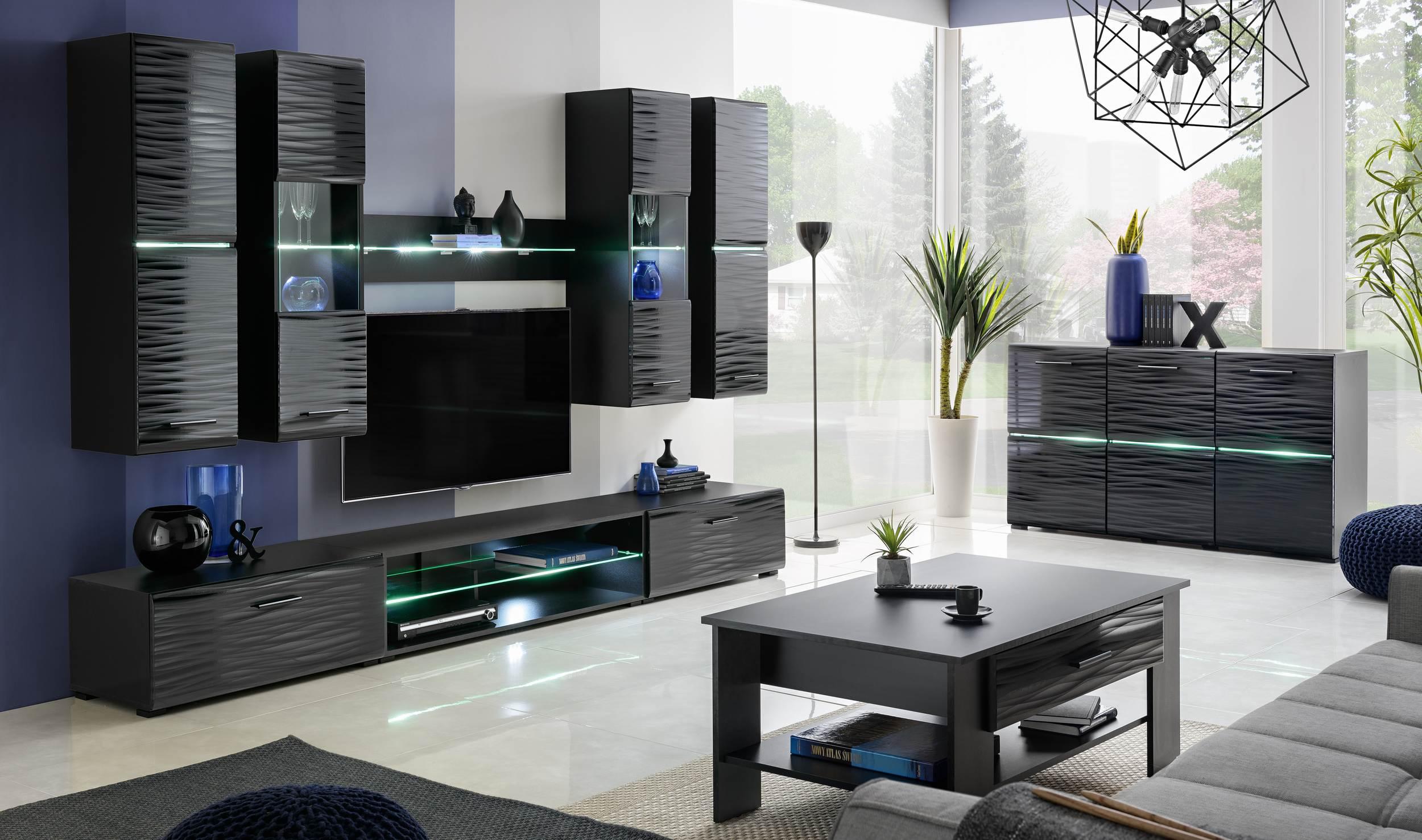 Das Stylefy Werse Wohnzimmerset in Schwarz Matt und Graphit vereint modernes Design mit praktischen Funktionen. Es umfasst zwei Hängeschränke, zwei Hängevitrinen, eine Kommode, ein Lowboard, einen Couchtisch und ein Wandboard. Die Möbelstücke sind mit Glaselementen und einer eleganten LED-Beleuchtung in Weiß ausgestattet. Die Montage gestaltet sich einfach und schnell, sodass Sie Ihr neues Wohnzimmer im Handumdrehen einrichten können. **Highlights** - Modernes Design für eine stilvolle Wohnatmosphäre - Glaselemente für eine ansprechende Optik - LED-Beleuchtung in Weiß für stimmungsvolles Licht - Einfache & schnelle Selbstmontage für unkomplizierte Einrichtung - Dezente Füße für einen eleganten Stand **Produkteigenschaften** - 2x Hängeschrank: (Hx Bx T) 116 x 33 x 35 cm - 2x Hängevitrine: (Hx Bx T) 116 x 33 x 35 cm - 1x Kommode: (Hx Bx T) 86 x 150 x 41 cm - 1x Lowboard: (Hx Bx T) 35 x 280 x 43 cm - 1x Couchtisch: (Hx Bx L) 46 x 65 x 105 cm - 1x Wandboard: (Hx Lx T) 23 x 120 x 19 cm - Griffe: Kunststoff **Lieferumfang** - 2x Hängeschrank - 2x Hängevitrine - 1x Kommode - 1x Lowboard - 1x Couchtisch - 1x Wandboard - Montageanleitung - Dekoration und Zubehör sind nicht enthalten