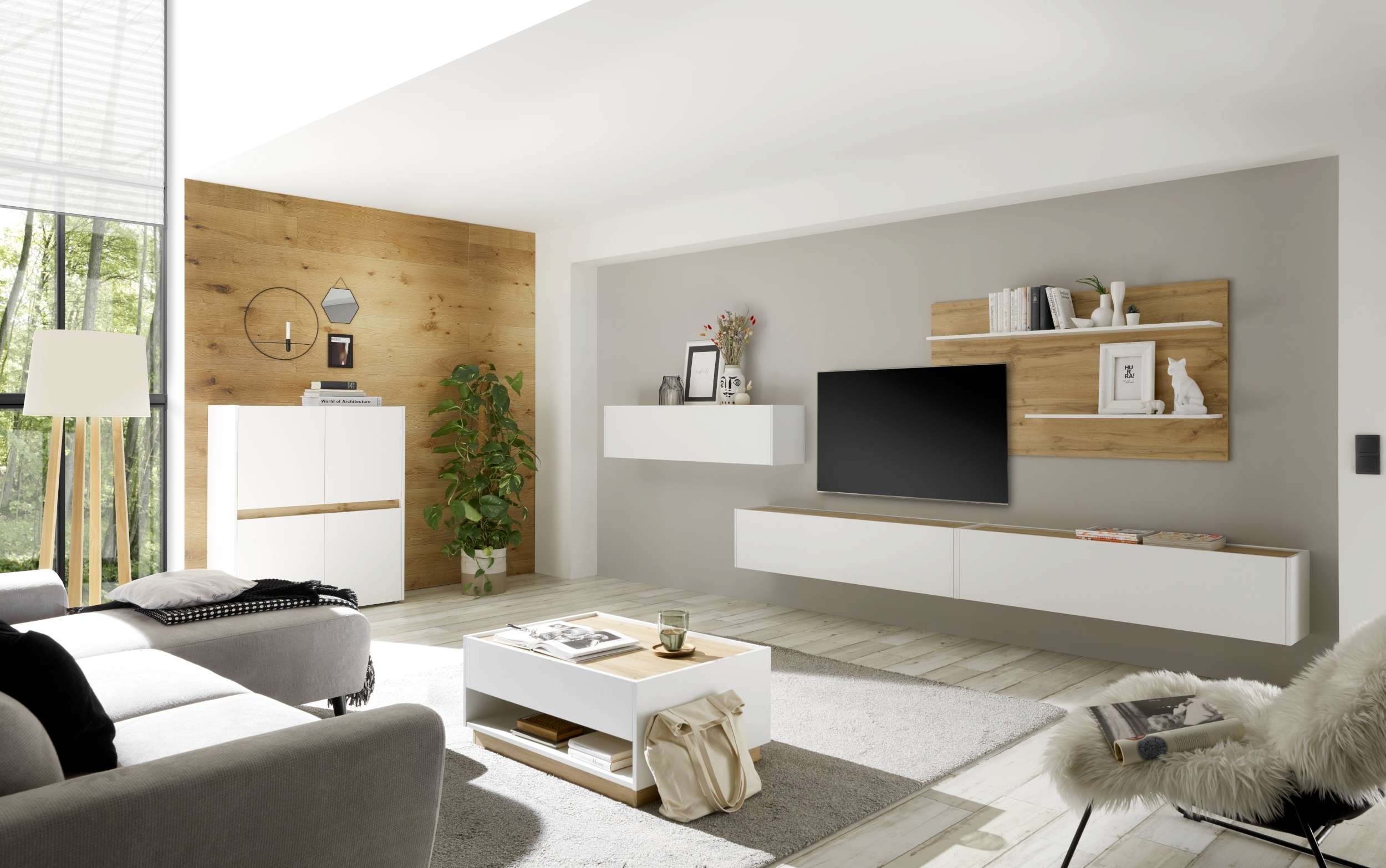 | Lieferumfang | 1x Couchtisch, 1x Highboard, 1x Wandpaneel, 3x Hängeschrank |