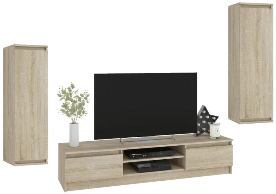 Das Wohnzimmerset CELTA in Sonoma überzeugt durch modernes Design und schlichte Linienführung. Hergestellt aus hochwertigem Material mit einer Dicke von 1,6 cm und ABS-Kanten, bietet es Schutz vor mechanischen Beschädigungen und Feuchtigkeit. Die grifflose Gestaltung der Türen sorgt für eine elegante Optik. Das Set umfasst zwei Hängeschränke und einen Fernsehtisch, ideal für Familien. **Highlights** - Modernes Design mit schlichten Linien - Hochwertiges Material mit 1,6 cm Dicke - ABS-Kanten für zusätzlichen Schutz - Grifflose Türen für eine elegante Optik - Ideal für Familien **Produkteigenschaften** - Farbe: Braun - Dekor: Sonoma - Material: LTD - Anzahl der Türen: 4 - Maße vom TV-Lowboard (HxBxT): 33 x 160 x 40 cm - Maße des Hängeschranks (HxBxT): 99 x 40 x 30 cm - Anzahl der Borde: 5 - Stil: modern **Lieferumfang** - 2x Hängeschränke - 1x Fernsehtisch - Ohne optionales Zubehör