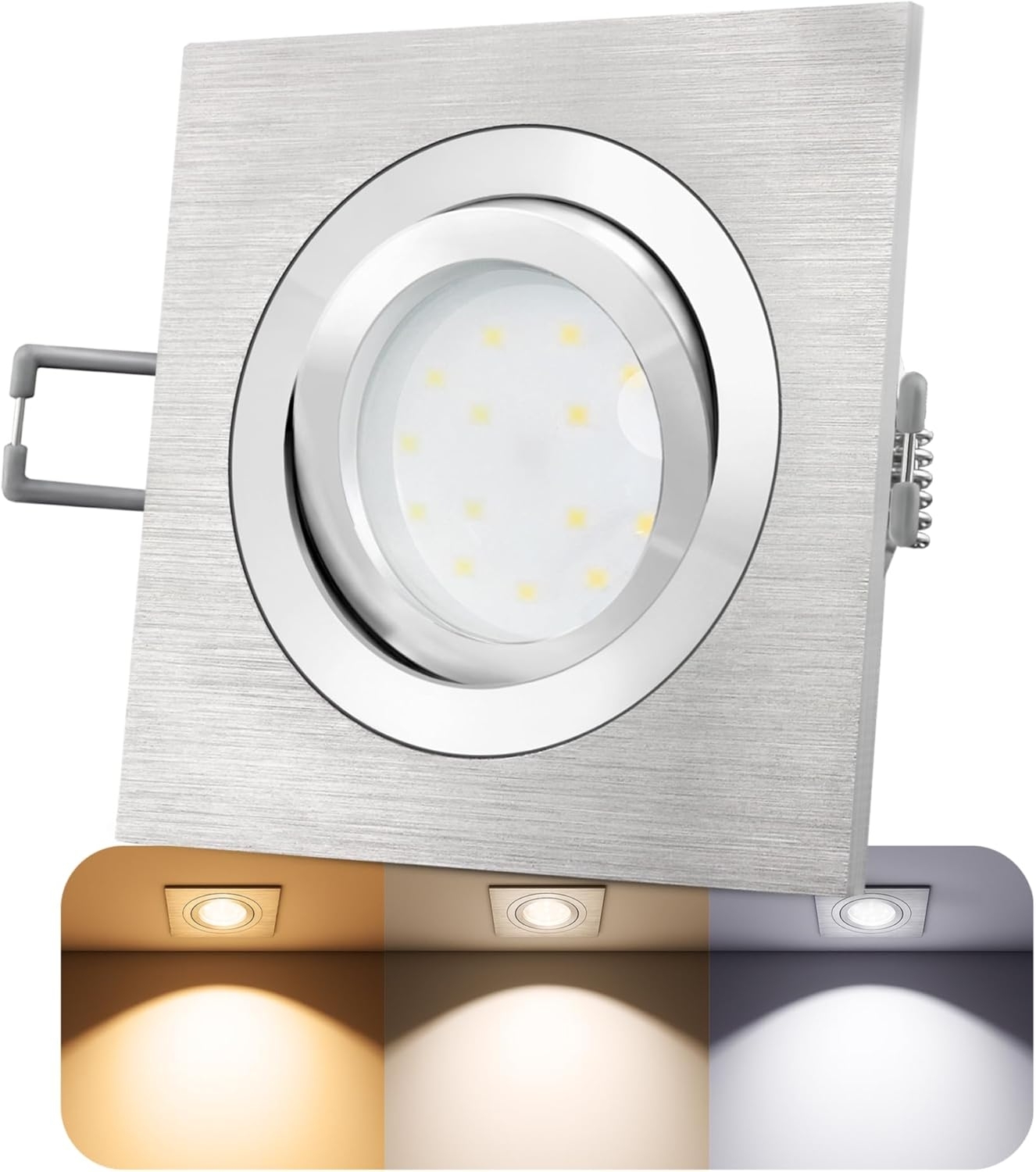 Der SSC-LUXon LED Einbaustrahler QF-2 ist ein schwenkbarer, flacher LED-Einbauspot aus hochwertigem Aluminium mit einer eleganten, gebürsteten Oberfläche. Mit einer Leistung von 4 W und einer Farbtemperatur von 2700 K sorgt er für warmweißes Licht und ist ideal für Wohn- und Arbeitsräume. Die einfache Montage und der direkte Anschluss an 230 V machen ihn besonders benutzerfreundlich. **Highlights** - Schwenkbar für flexible Lichtgestaltung - Warmweißes Licht mit 2700 K für angenehme Atmosphäre - Einfache Montage ohne Trafo - Hochwertiges Aluminium für Langlebigkeit - Geringe Einbautiefe für vielseitige Einsatzmöglichkeiten **Produkteigenschaften** - Farbe: Silber - Material: Aluminium - Abmessungen (H x B x T): 20 mm x 92 mm x 92 mm - Aussenabmessung: 92x92 mm - Lochmass Durchmesser: Ø 75 - 80 mm - Leistung (Pon): 4 W - Lichtstrom: 440 Lumen - Abstrahlwinkel: 110° - Energieeffizienzklasse: E - Schutzart: IP20 - Elektr. Schutzklasse: I - Dimmbar: Nein - Vergleichswert: ca. 40 W Halogen - Gewichteter Verbrauch: 4 kWh/1000 h - Stromversorgung: Kabelgebunden - Spannung: 220 bis 240 Volt und 50 Hertz - Oberflächenbehandlung: Gebürstetes Aluminium - Innenring glanzpoliert - Inkl. GU10-Fassung zum Anschluss an 230 V **Lieferumfang** - 1 x SSC-LUXon LED Einbaustrahler QF-2 - Anschlussleitung mit 20 cm - Leuchtmittel nicht enthalten