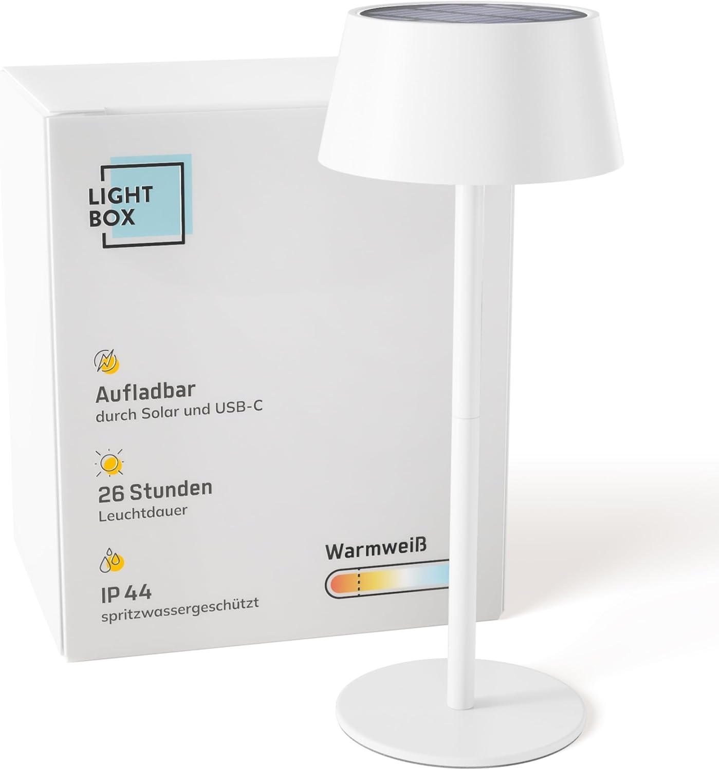 Die Lightbox LED Außen Tischlampe ist eine kabellose, solarbetriebene Tischleuchte mit einem Durchmesser von 13 cm. Sie bietet eine Helligkeit von 300 lm bei einer Farbtemperatur von 3000 K. Dank des 3-Stufen Touch-Dimmers können Sie die Lichtintensität nach Ihren Wünschen anpassen. Die Lampe ist aus Metall und Kunststoff in Weiß gefertigt und eignet sich ideal für den Außenbereich, da sie spritzwassergeschützt (IP44) und wetterfest ist. **Highlights** - Solarenergie: Selbst-aufladbar und umweltfreundlich - Spritzwasserschutz: IP44 für wetterfeste Nutzung im Freien - Kabellose Mobilität: Flexibel einsetzbar ohne Kabel - 3-Stufen Touch-Dimmer: Anpassbare Helligkeit für verschiedene Anwendungen - Vielseitig einsetzbar: Ideal als Tischlampe, Nachttischlampe oder für den Balkon **Produkteigenschaften** - Maße (HxBxT): 30 x 12,5 x 12,5 cm - Material: Metall / Kunststoff - Leistung: 4 W - Lichtstrom: 300 lm - Farbtemperatur: 3000 K **Lieferumfang** - 1 x Lampe (12,5 T x 12,5 B x 30 H cm) (weiß)