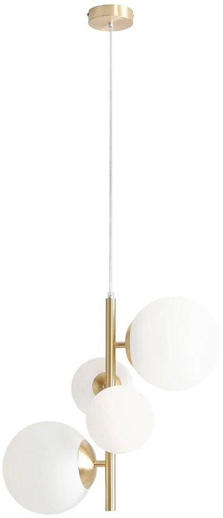 Die Pendelleuchte BLOOM 4B in Messing mit einer Länge von 120 cm überzeugt durch modische Glaskugeln und elegante milchige Schirme, die für eine angenehme Lichtverteilung im Raum sorgen. Diese Leuchte ist ideal für moderne Innenräume und lässt sich hervorragend mit der DIONE-Serie kombinieren, um beeindruckende Lichtarrangements zu schaffen. **Highlights** - Modische Glaskugeln - Elegante milchige Schirme - Exklusive BLOOM MULTICOLOUR Lampen - Perfekt für moderne Innenräume - Kombinierbar mit der DIONE-Serie **Produkteigenschaften** - Maße: 120 cm - Material: Messing - Umlaufende Glaskugeln in 14 cm und 20 cm - Schirme erzeugen angenehmes, gut verteiltes Licht - Harmoniert mit der DIONE-Serie