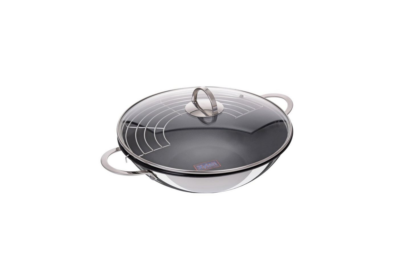 **GRÄWE Wok-Set 32 cm, mit Beschichtung, mit Ablagegitter** Das GRÄWE Wok-Set besteht aus einer Edelstahl-Wokpfanne, einem Ablagegitter und einem passenden Glasdeckel. Die Wokpfanne ist mit Xylan beschichtet. Xylan ist eine gängige Antihaftbeschichtung für Edelstahlpfannen. Der Glasdeckel für den Wok besteht aus gehärtetem Glas und ist mit einem Edelstahlring umfasst. Durch das integrierte Dampfloch wird der entstehende Dampf abgeleitet. Das Wok-Set beinhaltet ein Ablagegitter, das optional eingesetzt werden kann.